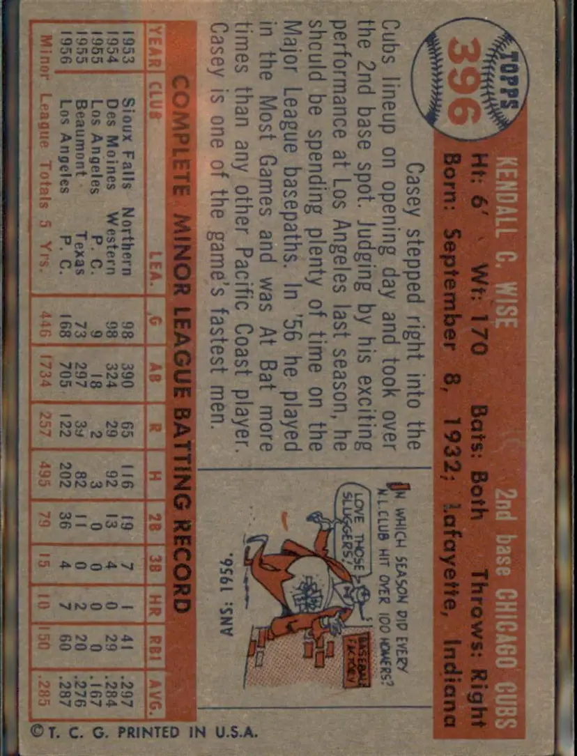 1957 Topps #396 Casey Wise - (pk1) - Chicago Cubs