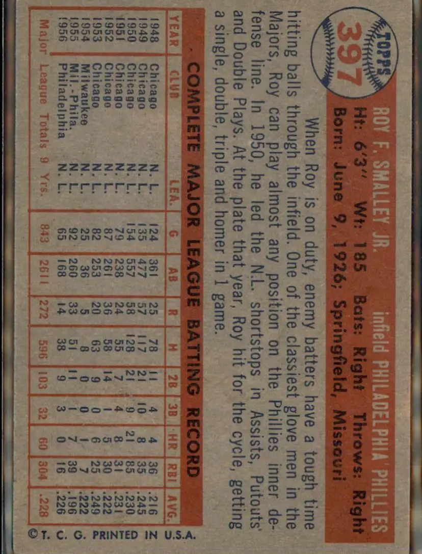 1957 Topps #397 Roy Smalley - (pk1) - Philadelphia Phillies