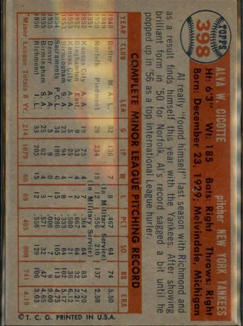 1957 Topps #398 Al Cicotte - ( pk1 ) - New York Yankees