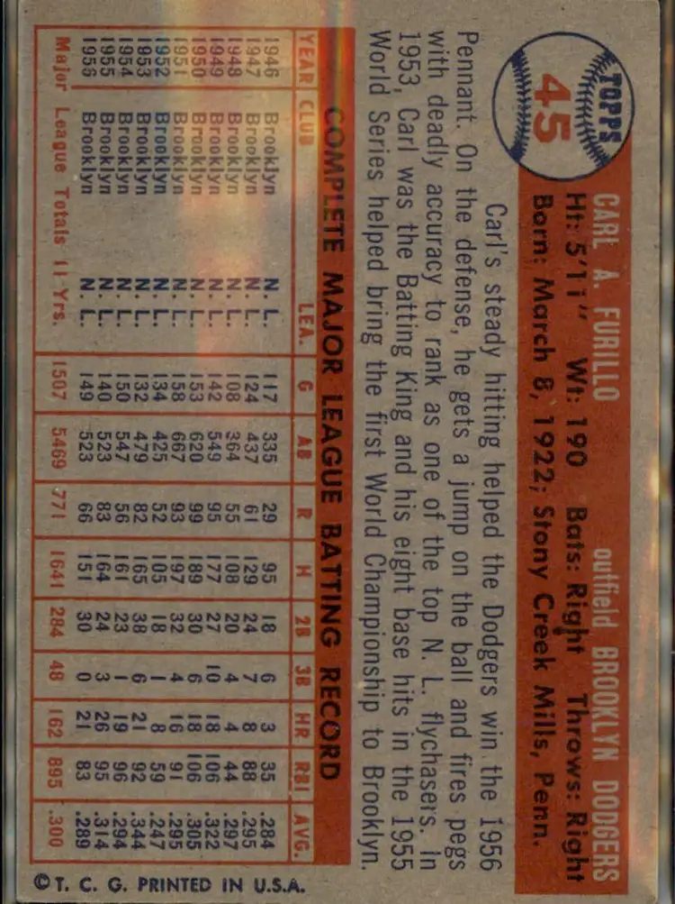 1957 Topps #45 Carl Furillo - ( pk1 ) - Brooklyn Dodgers