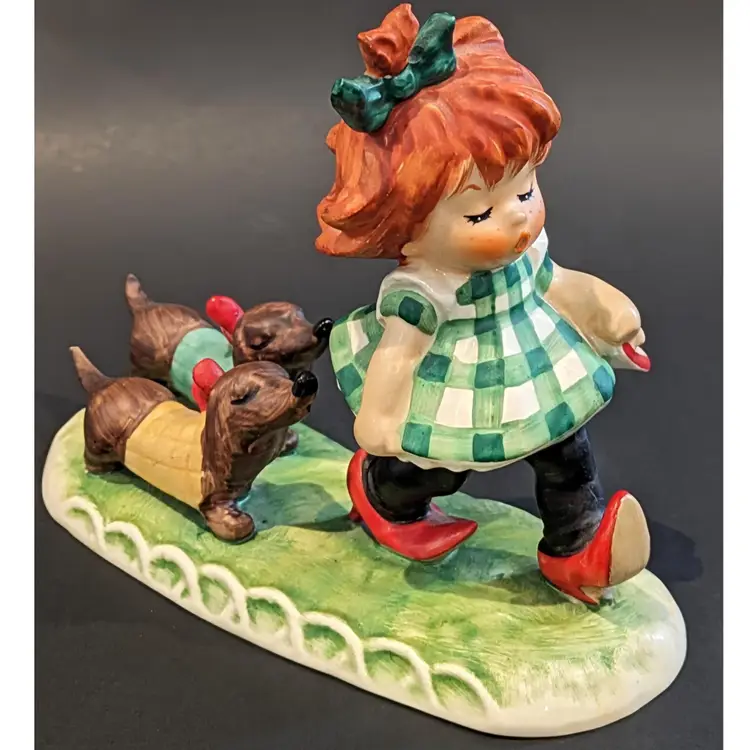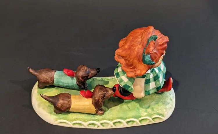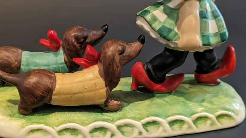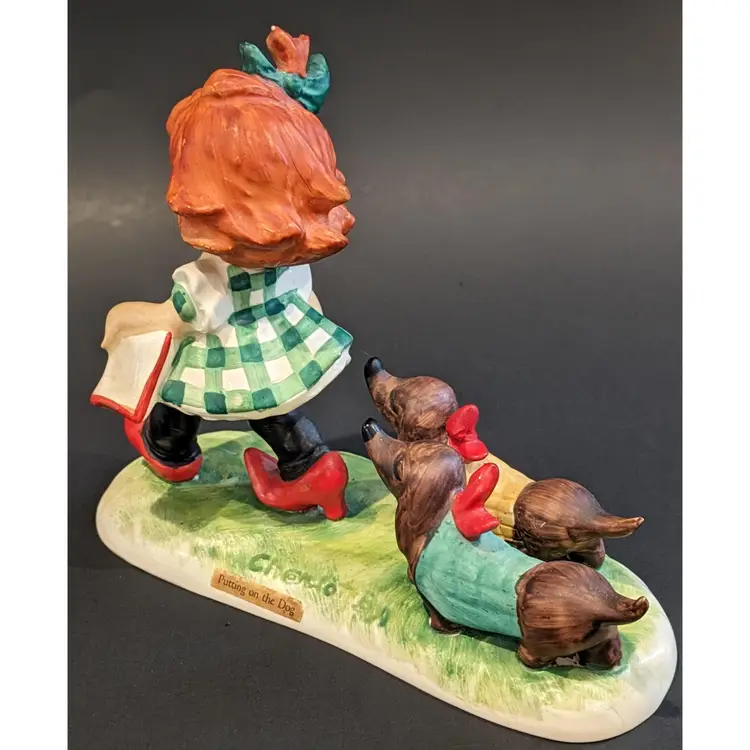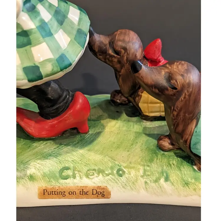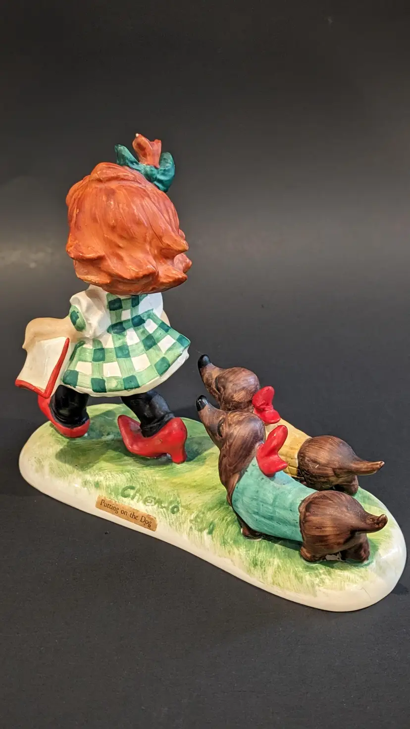 4.25" tall x 5.75" long x 2.25" wide, She is adorable with lots of attitude, The only condition issue would be the top of the red bow on the yellow dog has a professional repair, totally note noticeable, overall this piece is in amazing condition, the paint is good! She has all of her provenance including the paper sticker label that says Putting on the dogs which adds to the value of the piece. Cute!