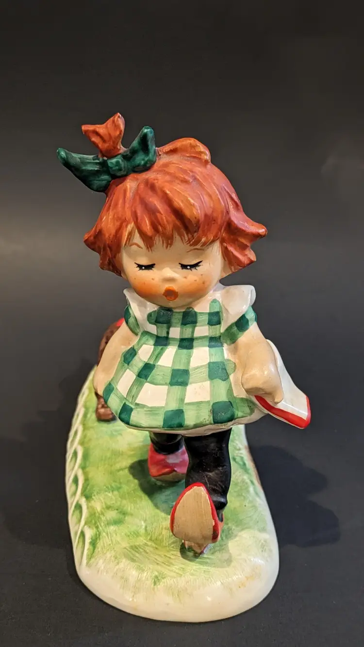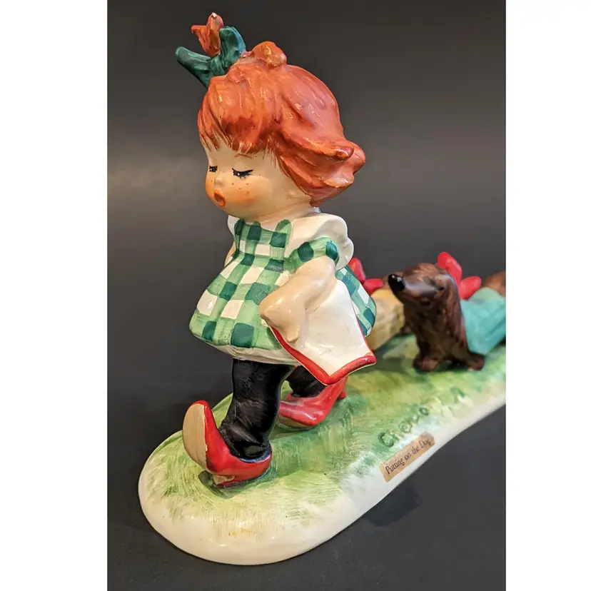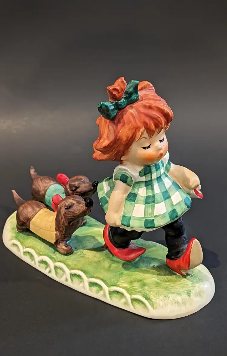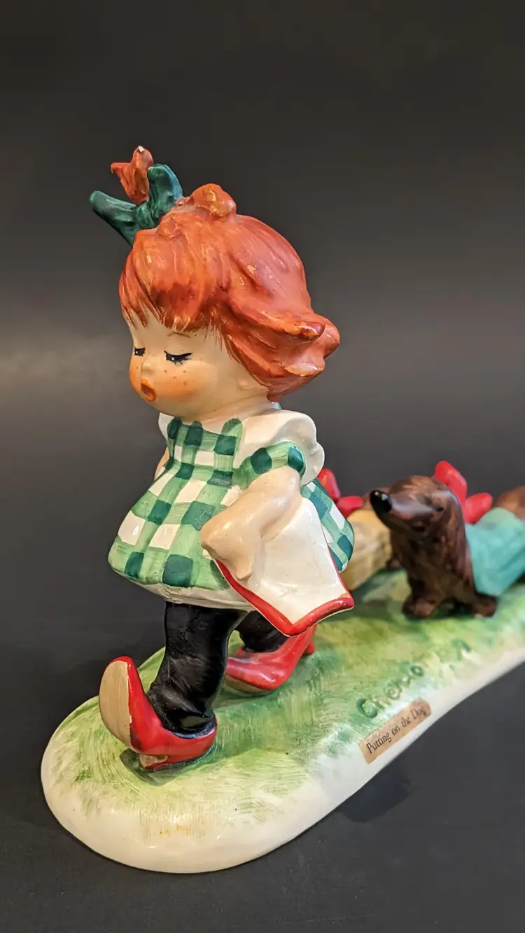 4.25" tall x 5.75" long x 2.25" wide, She is adorable with lots of attitude, The only condition issue would be the top of the red bow on the yellow dog has a professional repair, totally note noticeable, overall this piece is in amazing condition, the paint is good! She has all of her provenance including the paper sticker label that says Putting on the dogs which adds to the value of the piece. Cute!