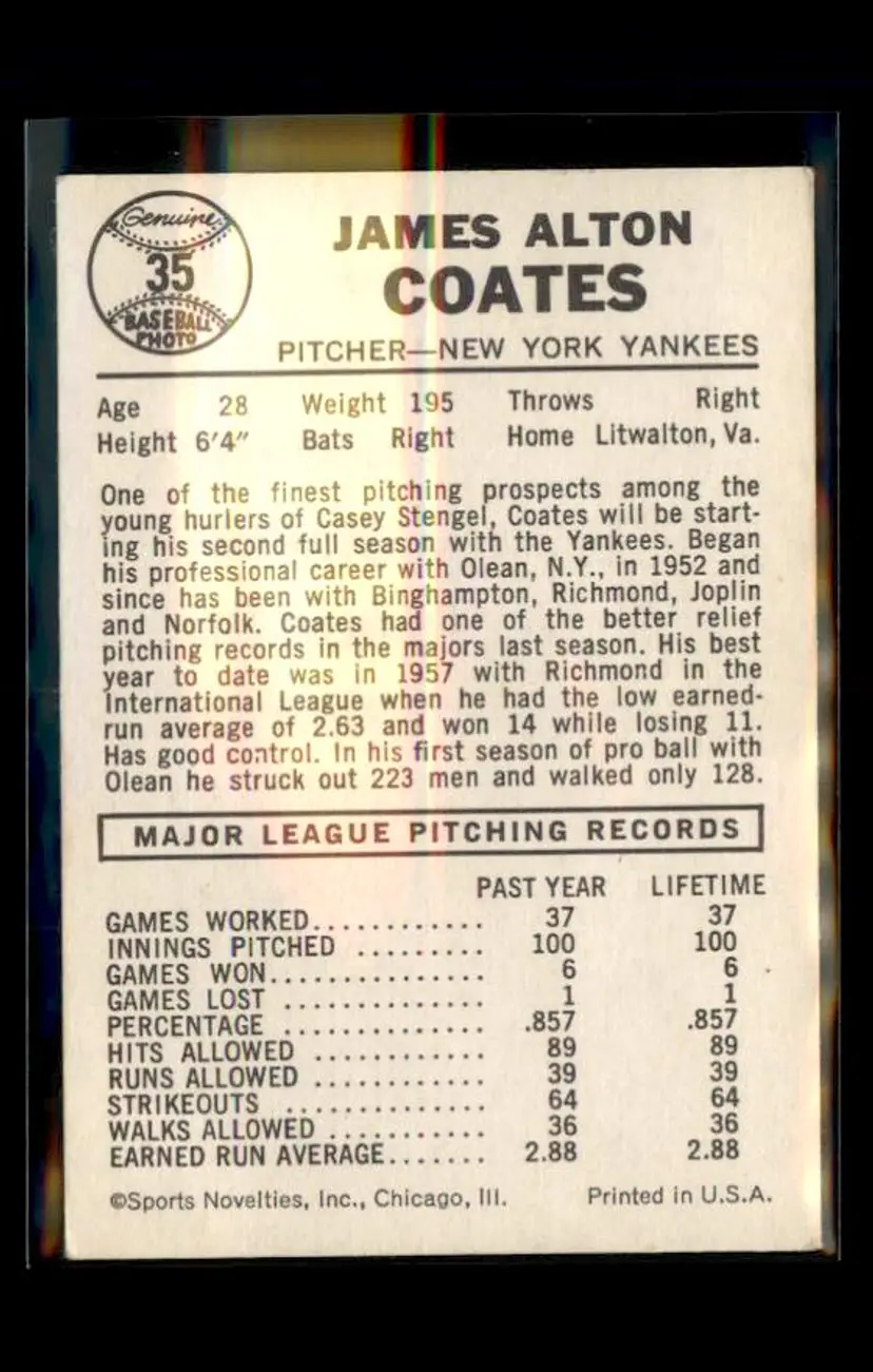 1960 Leaf #35 Jim Coates - (pk1) - New York Yankees