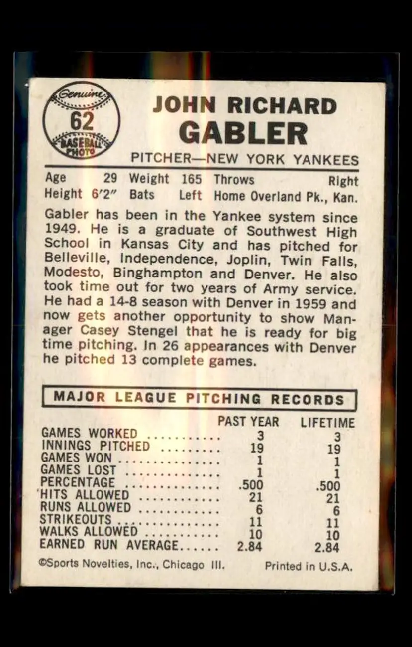 1960 Leaf #62 John Gabler - (pk1) - New York Yankees