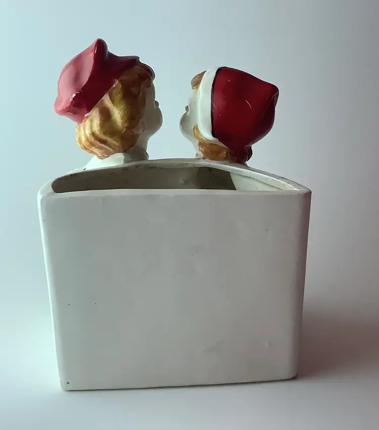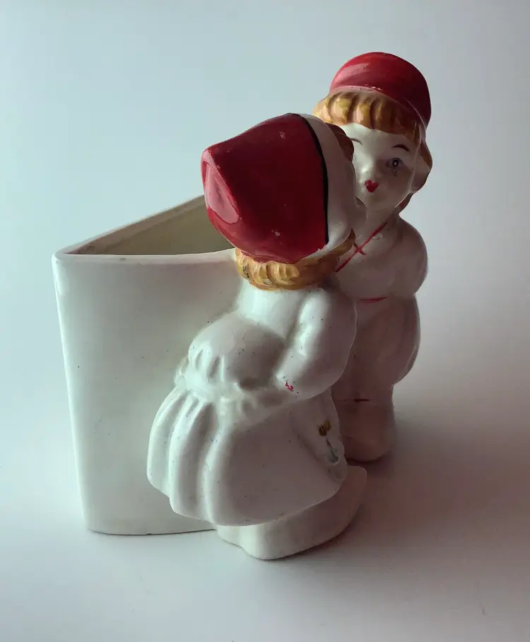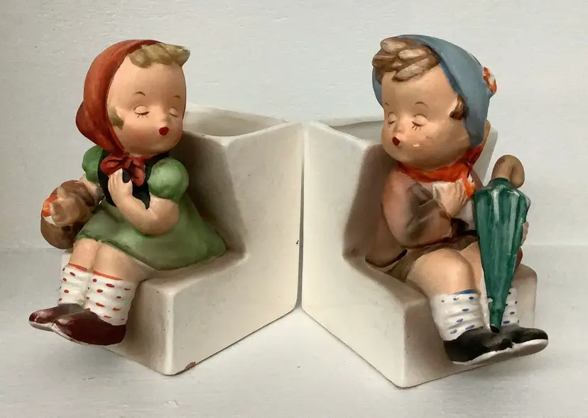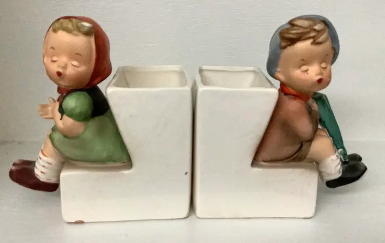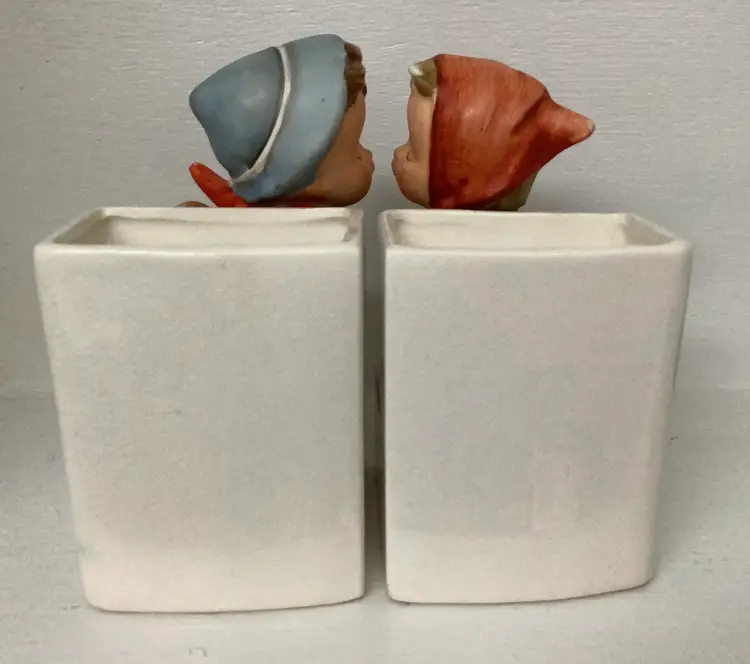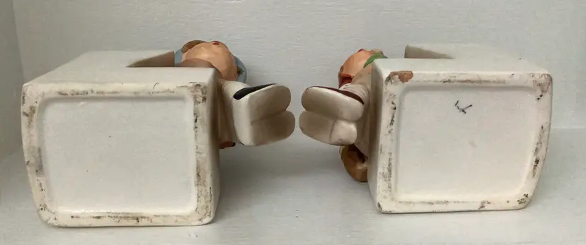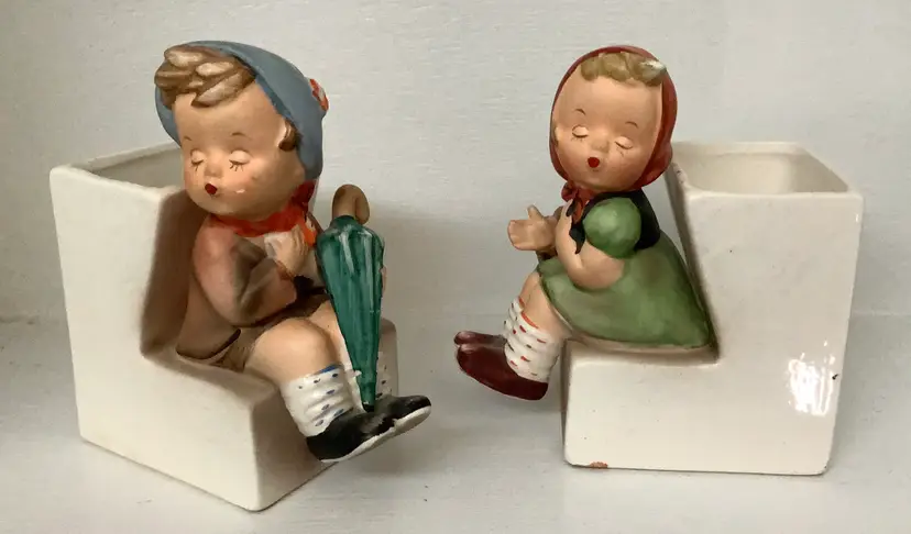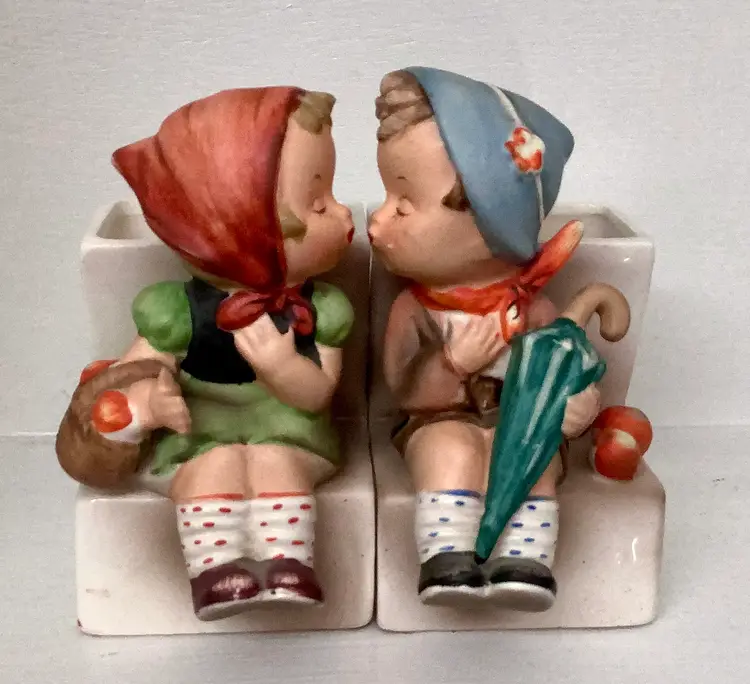 These are vintage from the 1960s. The first couple comes from Napco or similar maker, according to Google search. It measures 5.5” x 5” x 3”. Some paint loss from time, no chips cracks or breaks. Hummel couple has a tiny signature on bottom Please see photos. They measure 4” x 4” x 2.5”. Good condition. I ship 3 day UPS and pack, bubble wrap very carefully for safe transit. Thanks!