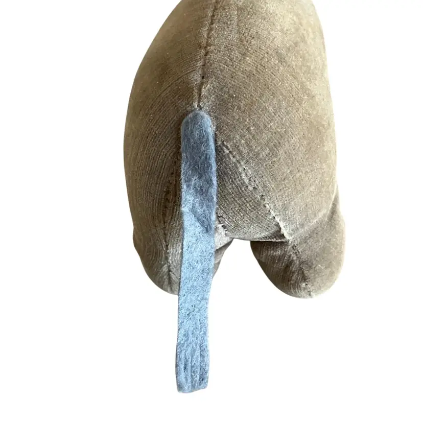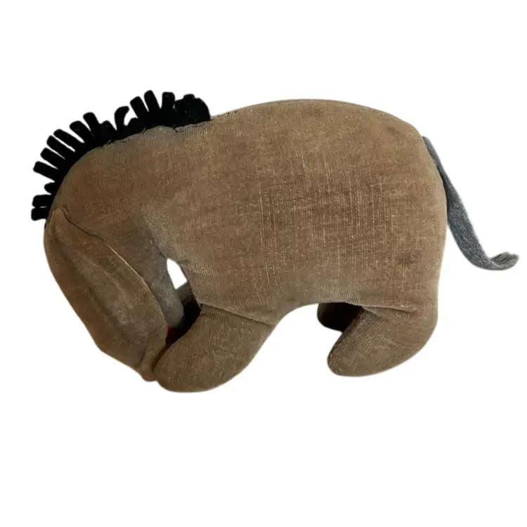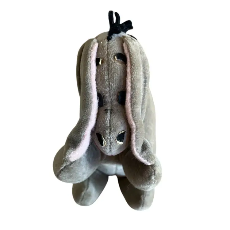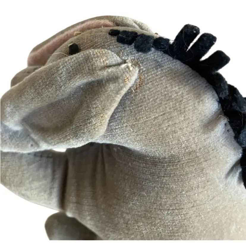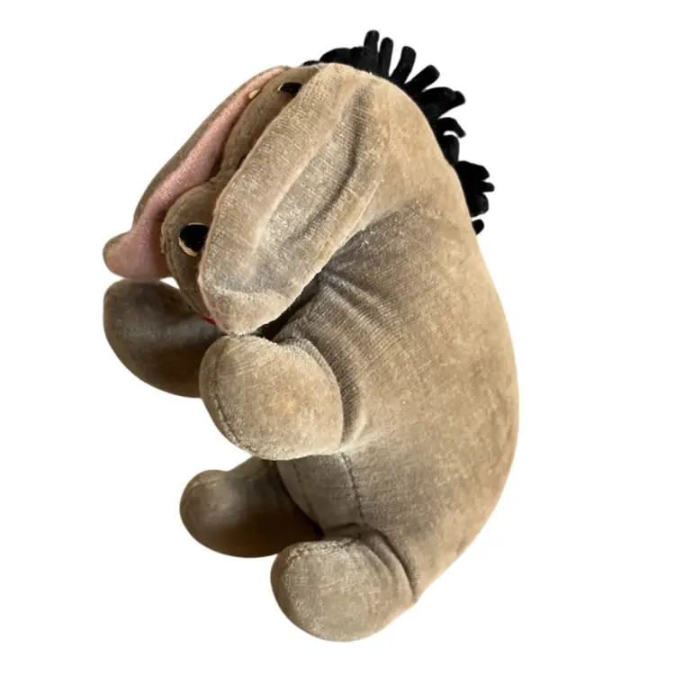 Cute little stuffed Eeyore with some wear and tear that gives him that “woe is me” look that we all know him for. He has some repair stitches on the back and neck which actually give him some extra character. Two of his mane hairs are missing 1/2. The ears are glued down to sides of his head. I’m not sure if was produced this way or glued down after production. The nostrils and eyebrows have wear with white showing. The original tag was cut off. There are spots of discoloration or stains on the body. Please see all close up photos for condition and details thank you.