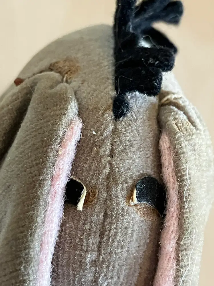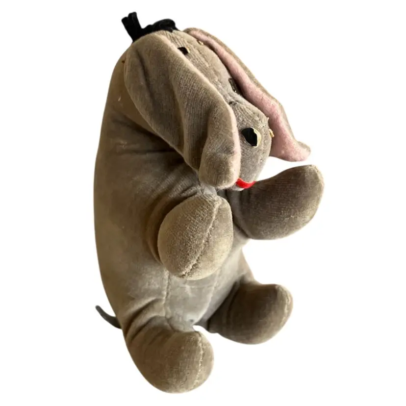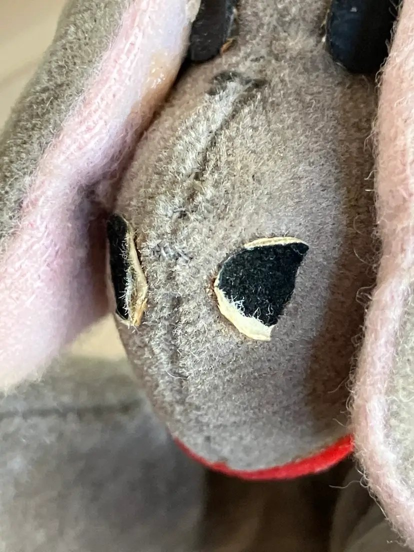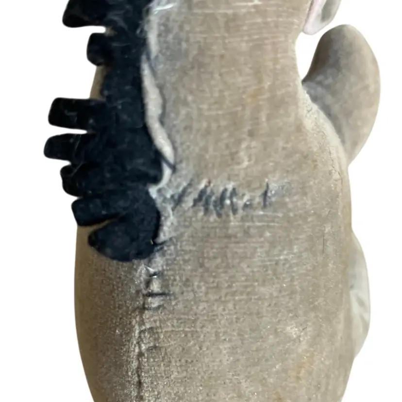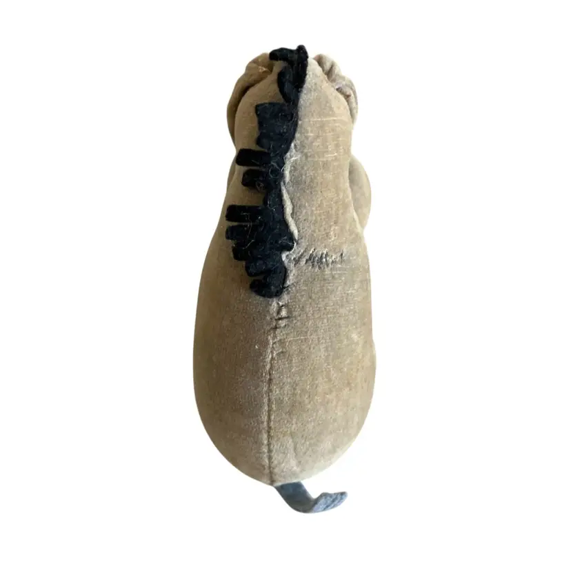 Cute little stuffed Eeyore with some wear and tear that gives him that “woe is me” look that we all know him for. He has some repair stitches on the back and neck which actually give him some extra character. Two of his mane hairs are missing 1/2. The ears are glued down to sides of his head. I’m not sure if was produced this way or glued down after production. The nostrils and eyebrows have wear with white showing. The original tag was cut off. There are spots of discoloration or stains on the body. Please see all close up photos for condition and details thank you.