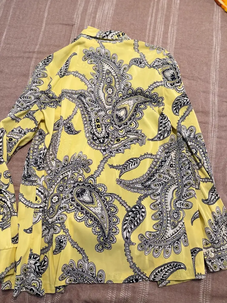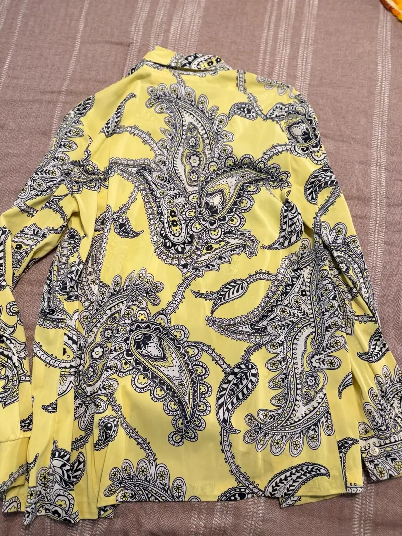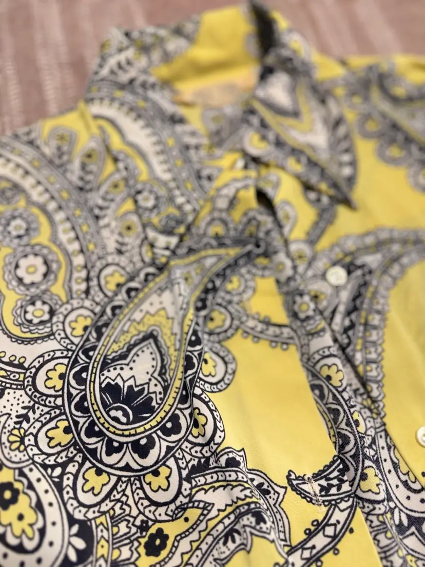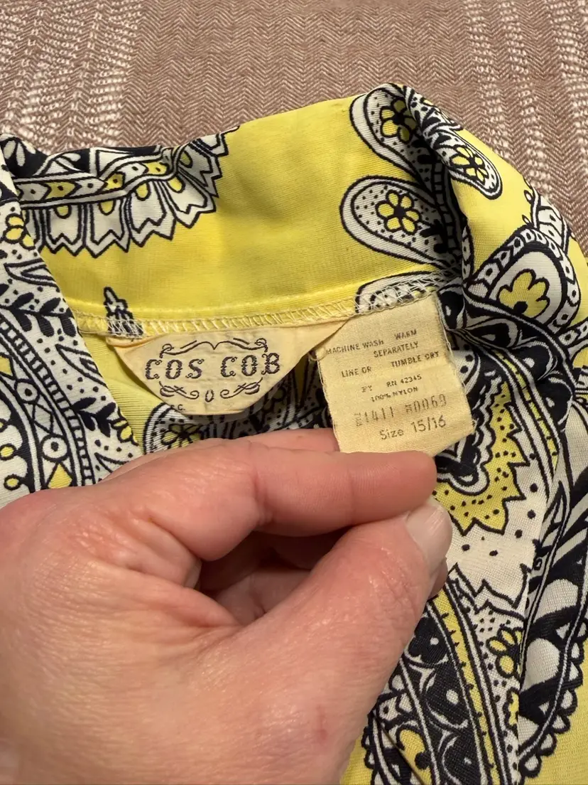 1960’s Cos Cob dagger collar button up in a fantastic yellow paisley print. Good overall condition does have some minor yellowing due to age. Has not been treated. It’s tagged a size 13/14