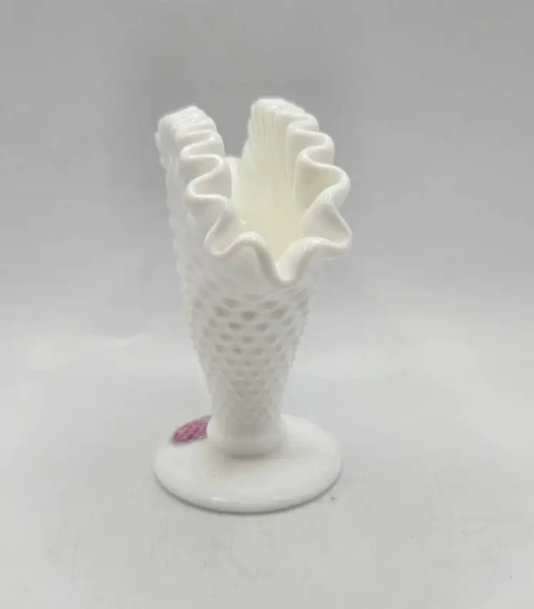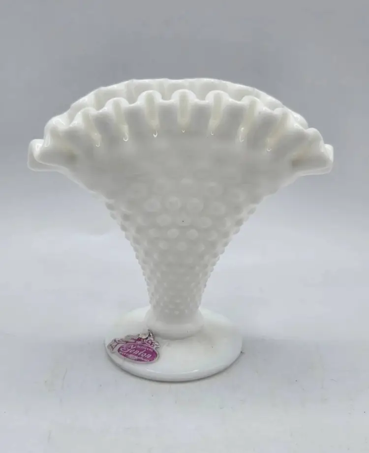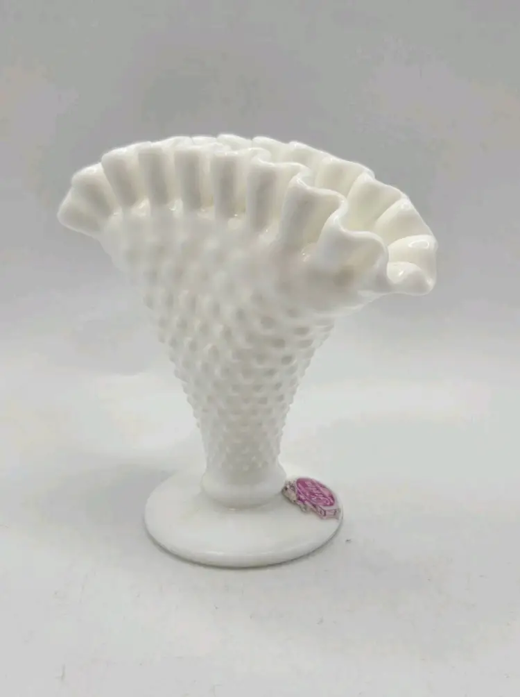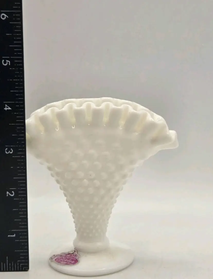 1960s Fenton White Hobnail Fan Milk Glass Vase • Ruffled Edge 4" Original Label Approx 4" H Very good condition. No chips, cracks, or breaks. Areas of minimal wear. See pictures.