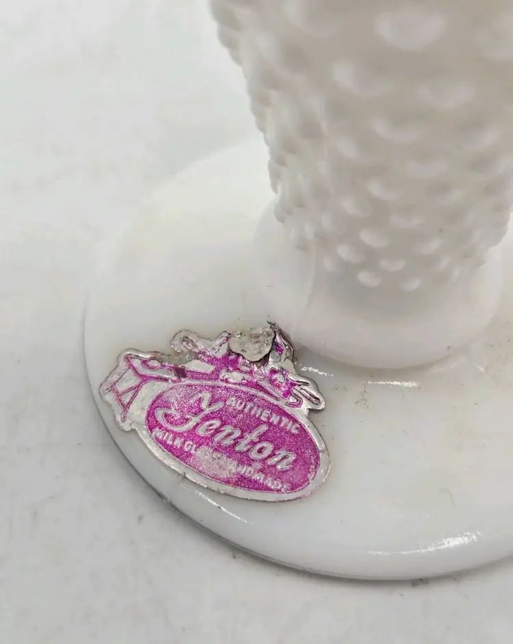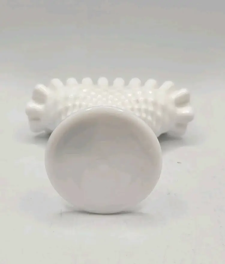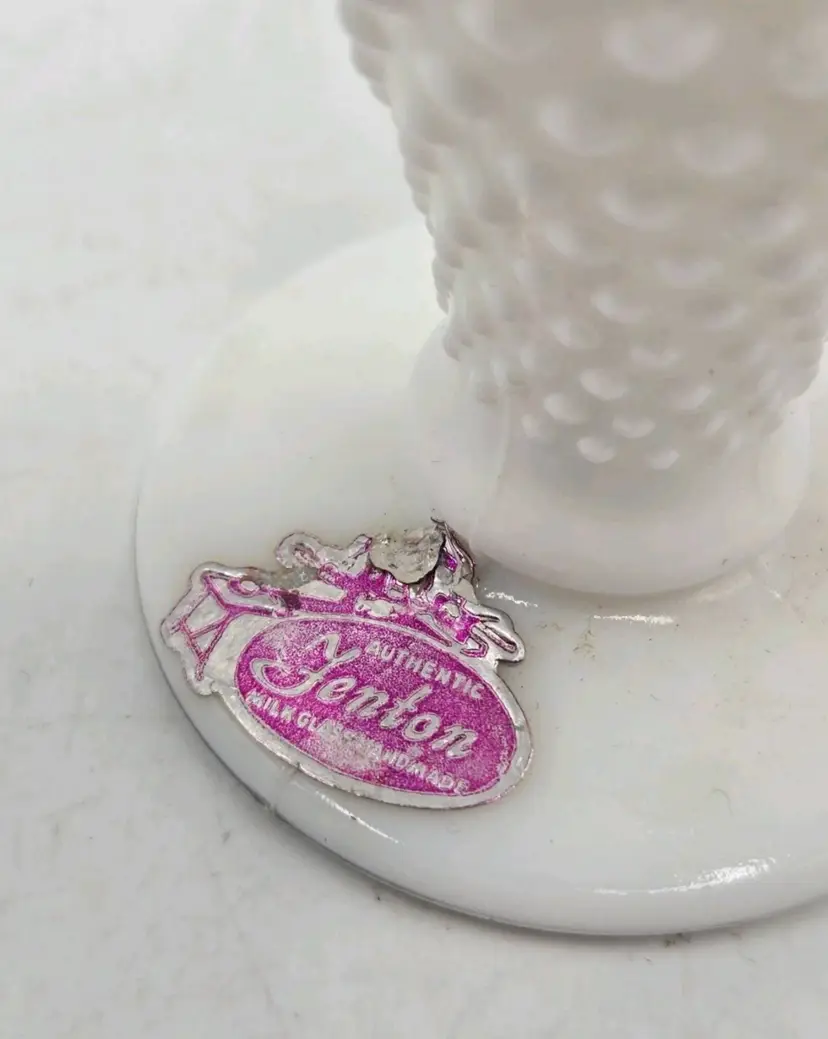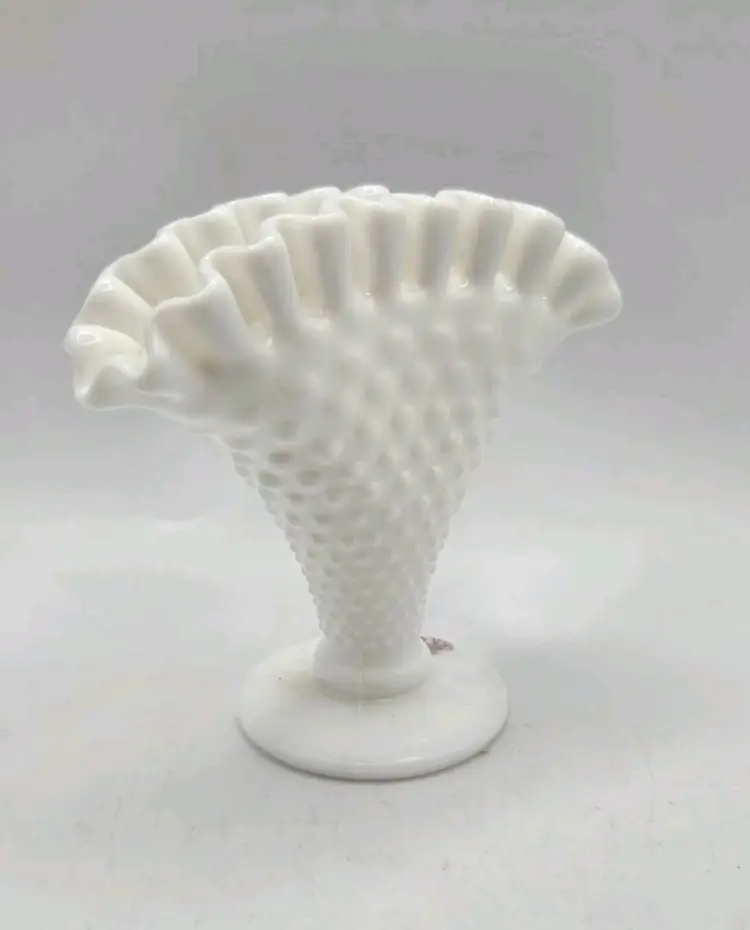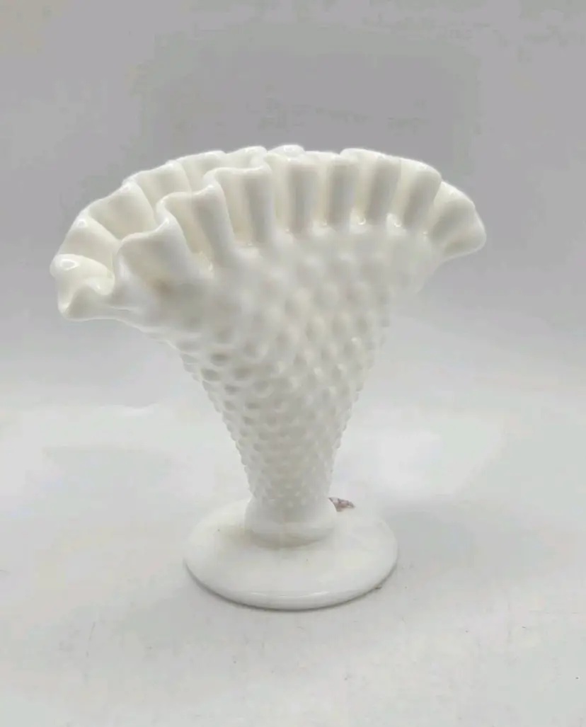 1960s Fenton White Hobnail Fan Milk Glass Vase • Ruffled Edge 4" Original Label Approx 4" H Very good condition. No chips, cracks, or breaks. Areas of minimal wear. See pictures.