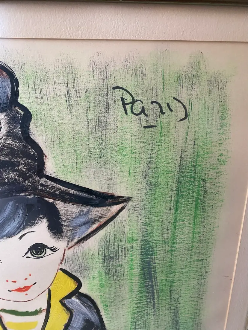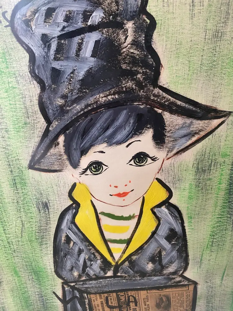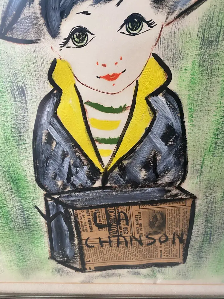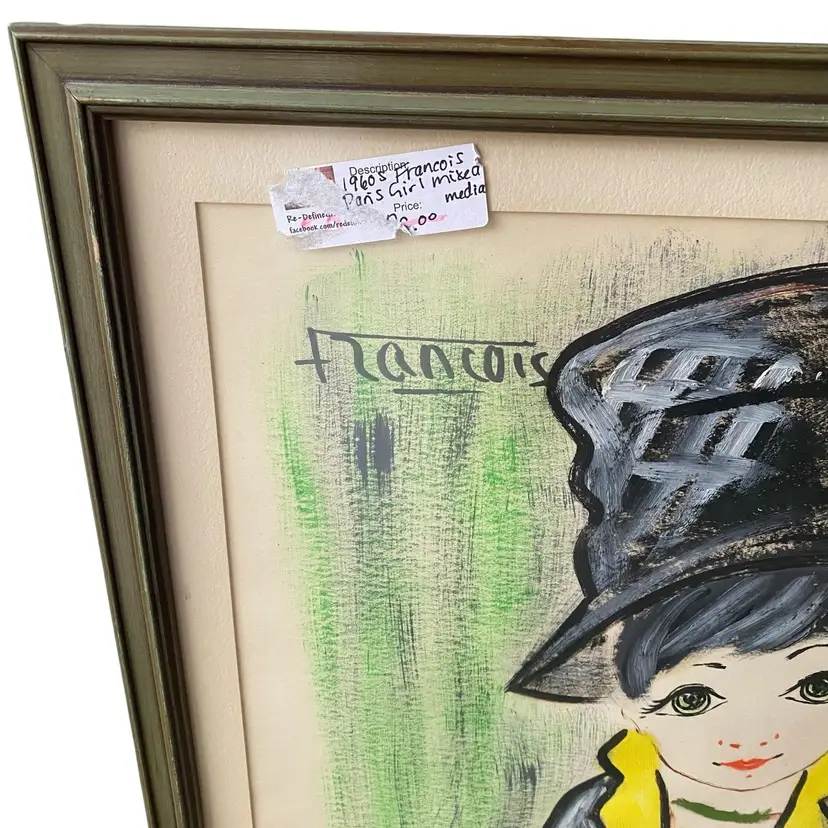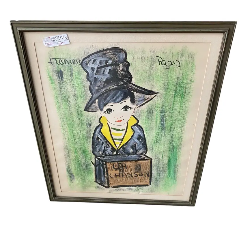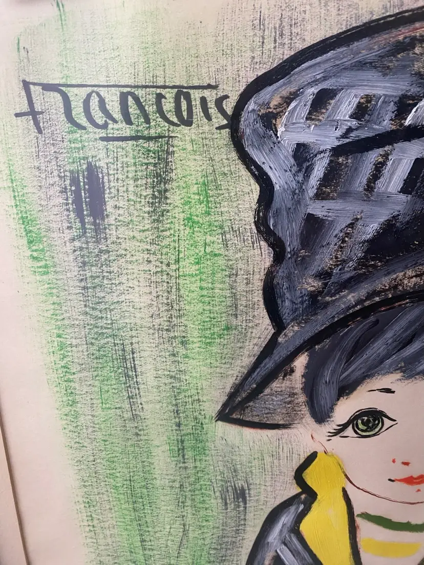 1960's Francois Paris Girl W/ Hat Greens, Black, Acrylic Collage Mixed Media Art 25.5x21.5