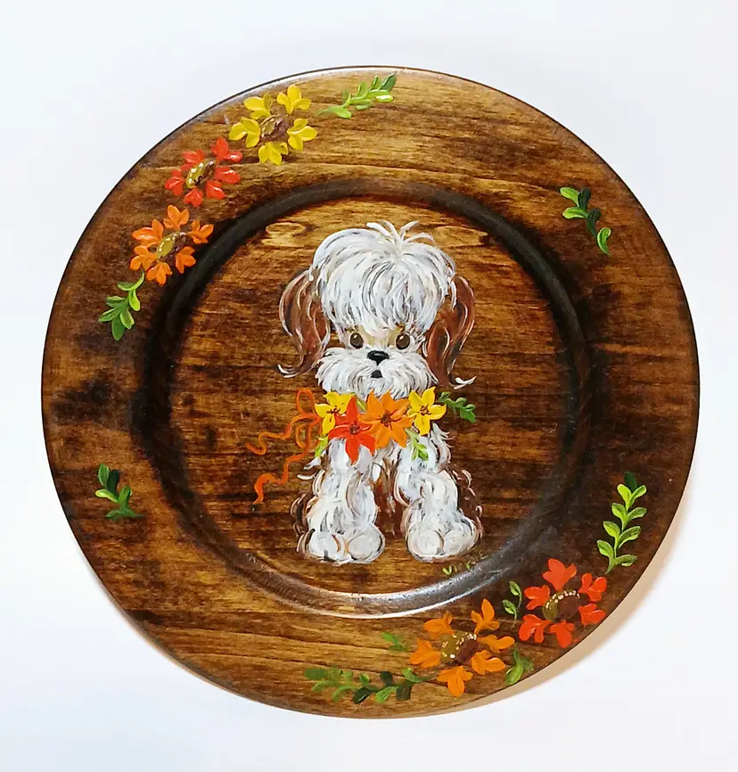 Vintage 1960's artist signed, hand painted Poodle puppy on a lacquer wood plate. Approximately 8" diameter. Signed "Vickie". In good pre-owned condition.