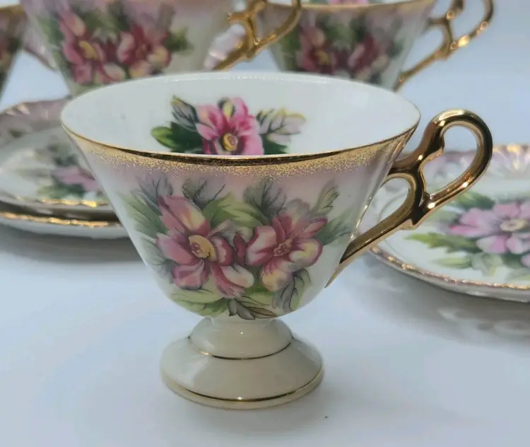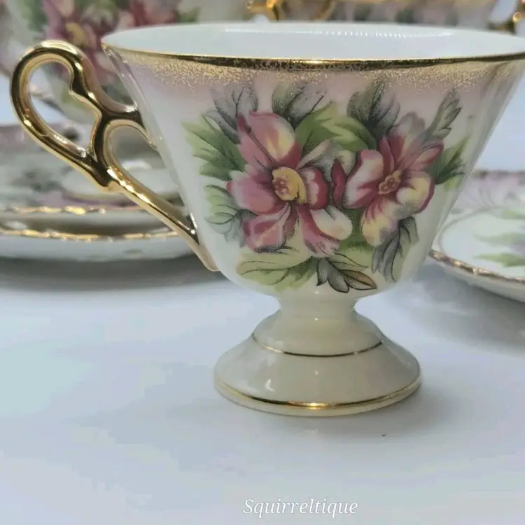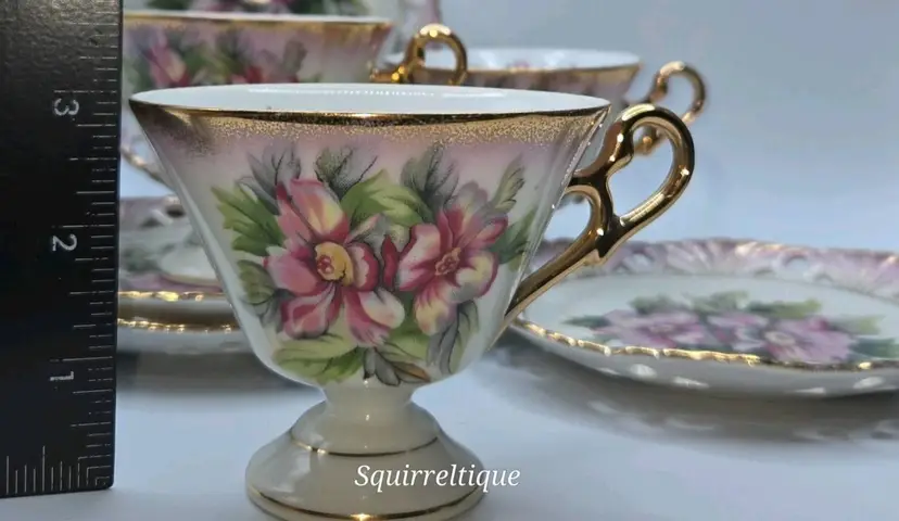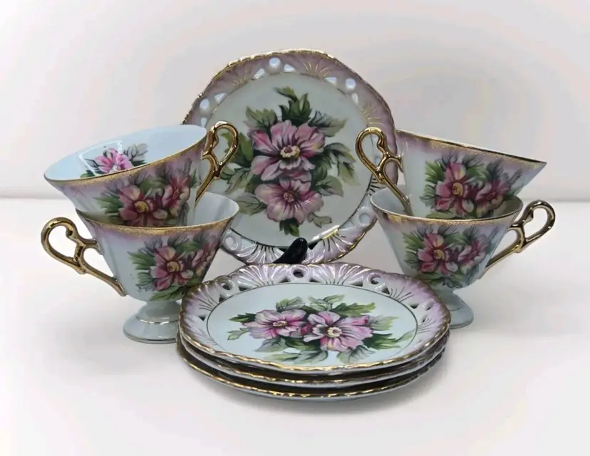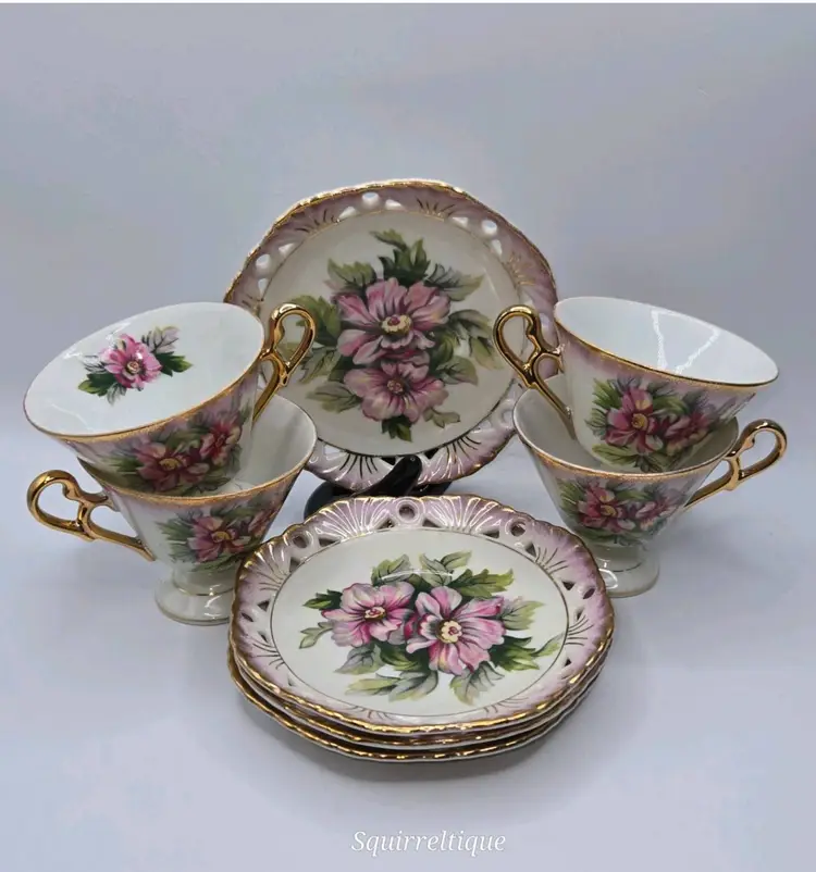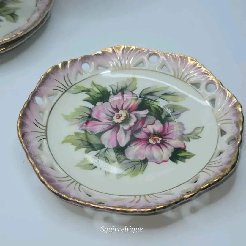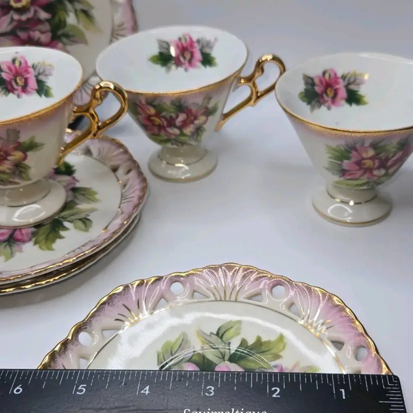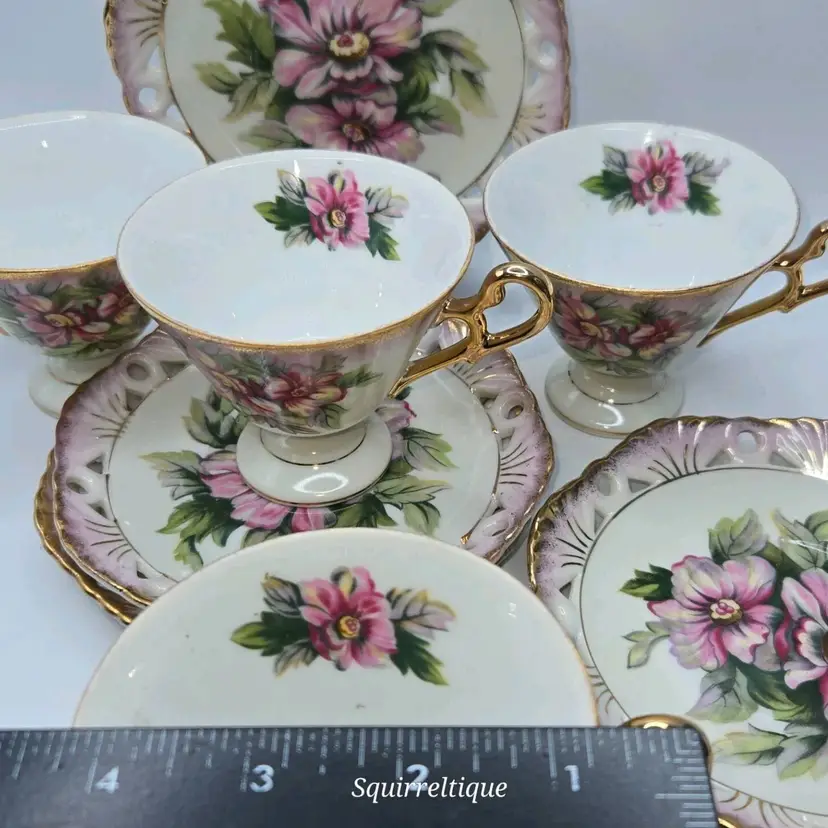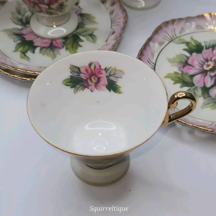 1960s LEFTON Japan S/4 Hand Painted Floral Footed Cup/Reticulated Saucer 801 EUC