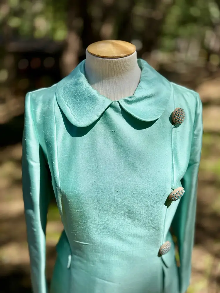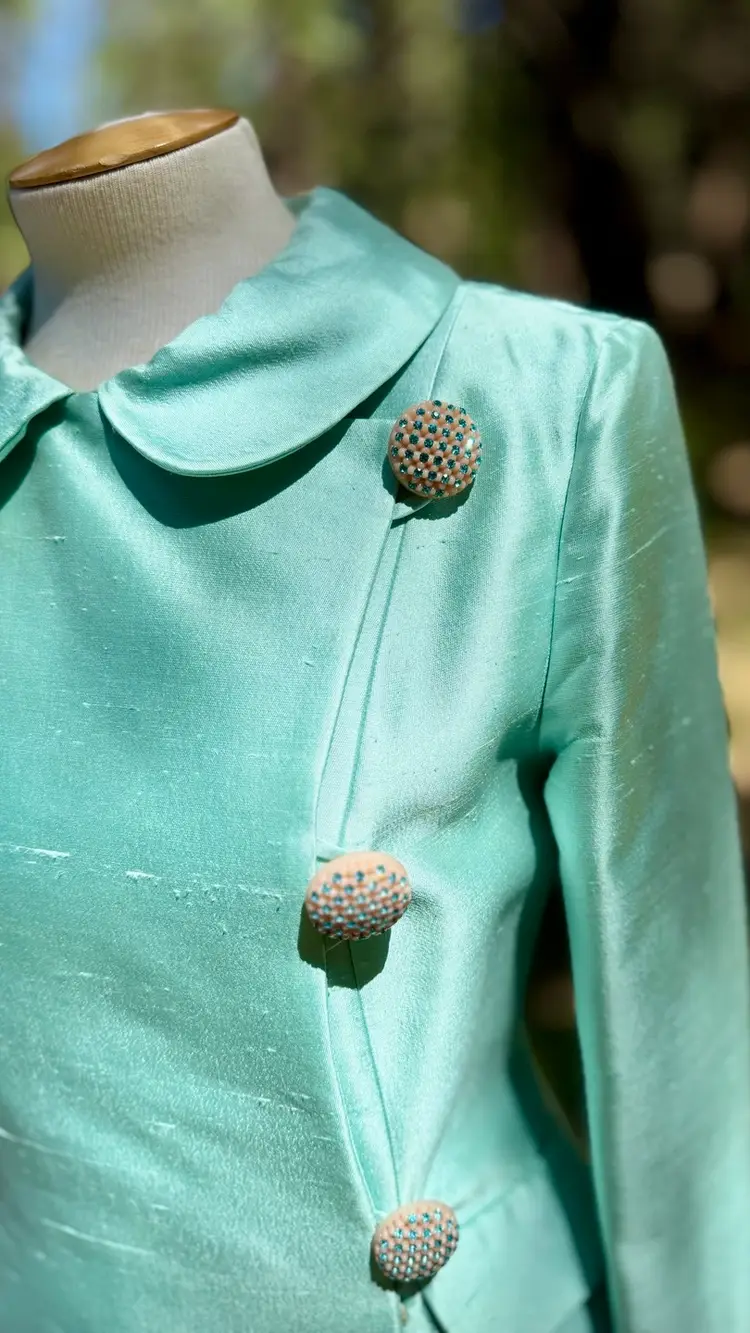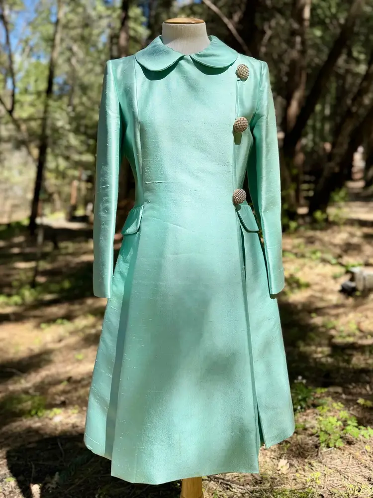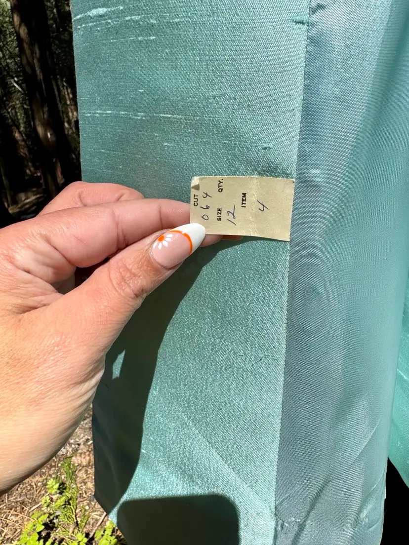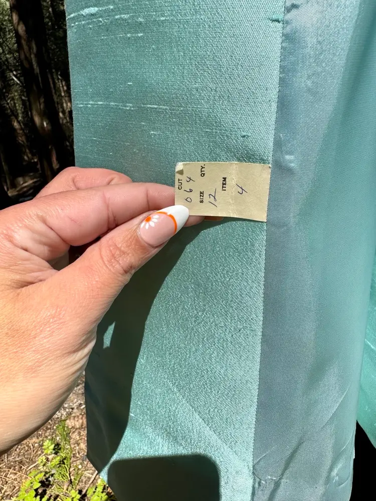 You guys. This beauty is so stunning, I wish pictures did her justice (and she looks great in them!). Peter Pan colar, snatched waist (not the tech term I’m sure, two pockets!! (Hidden behind the faux pocket flaps), three outer buttons, 5 inner snaps to help with shape. WORN ONCE. The story goes that the woman who owned this was gifted it by her husband for their honeymoon, she wore it during said honeymoon, and when she saw that she got it dirty was so embarrassed that she hid it from her husband and never wore it again. 🤷🏽♀️ It has very evidently never been laundered— paper tag is still crisp and new. Have not attempted to get her dry cleaned but I could I suppose.