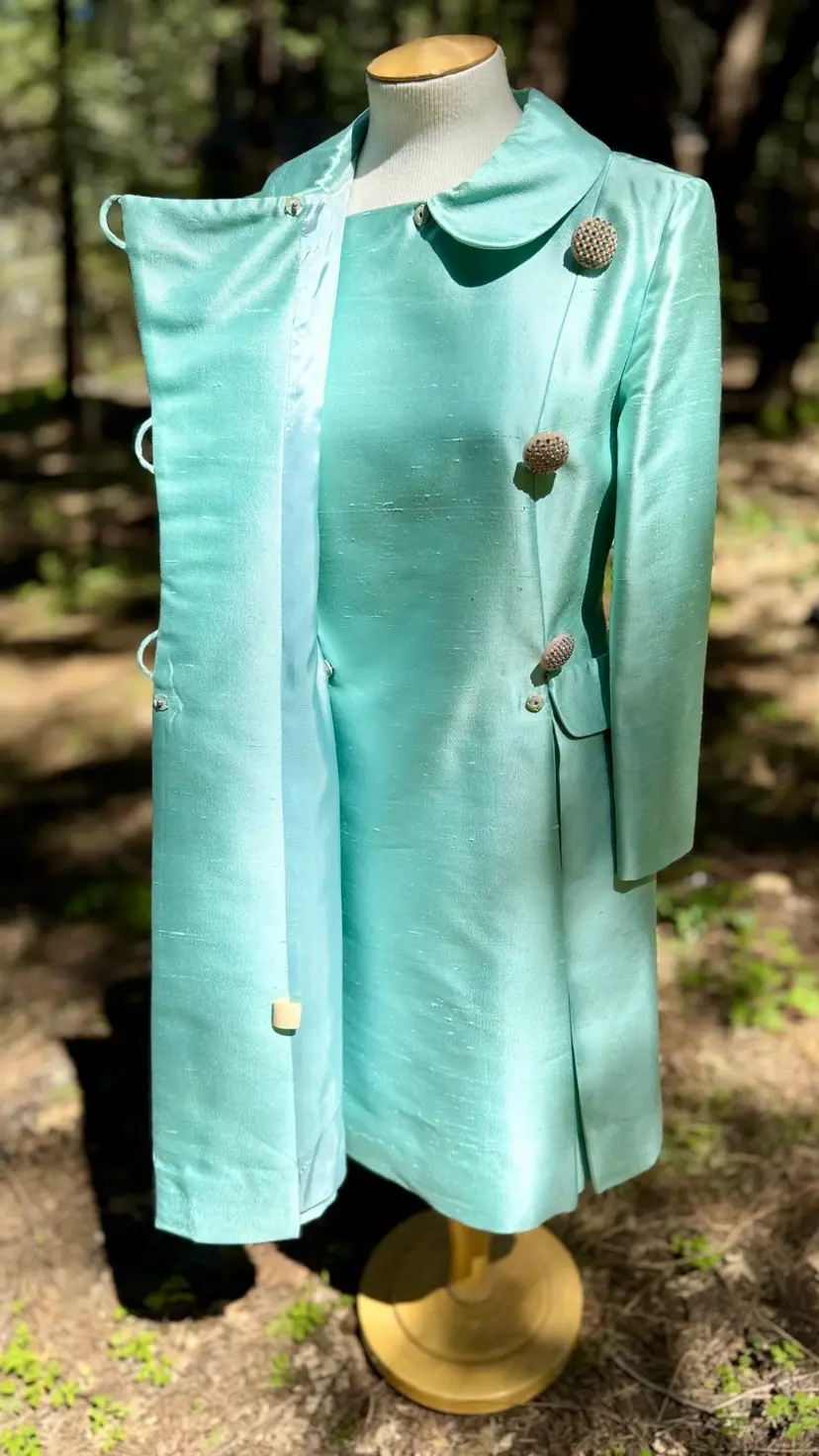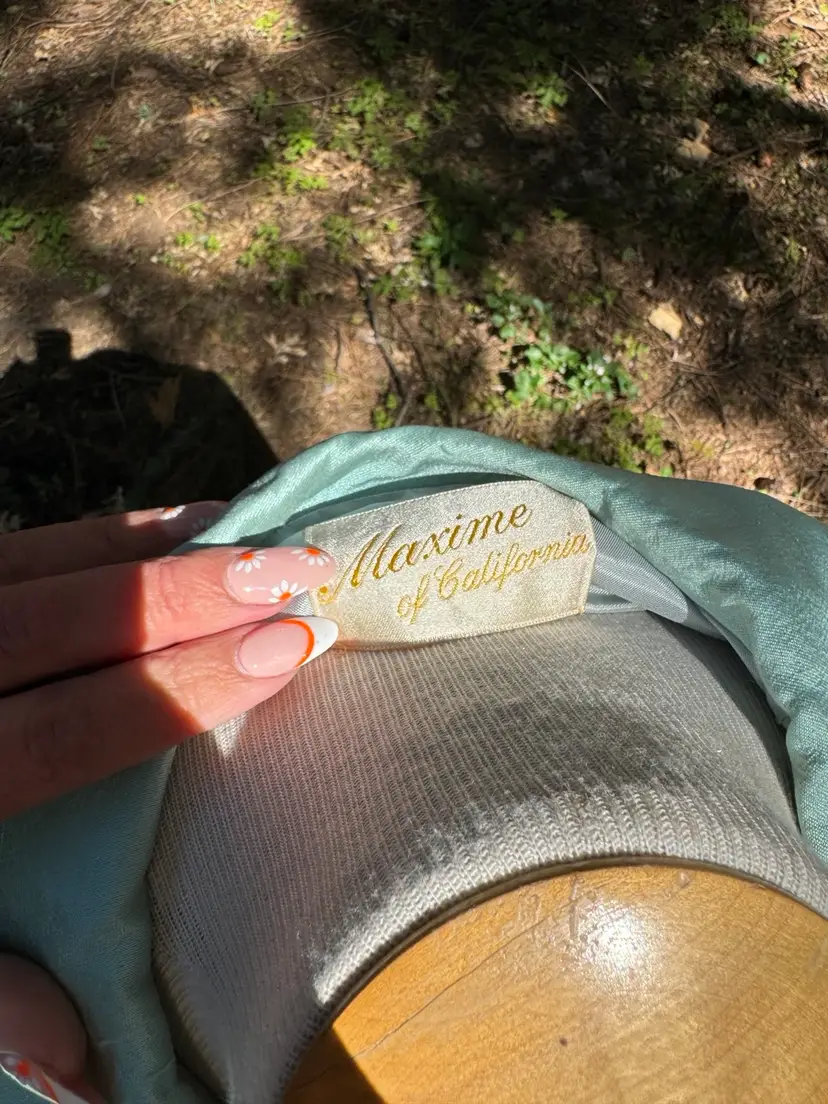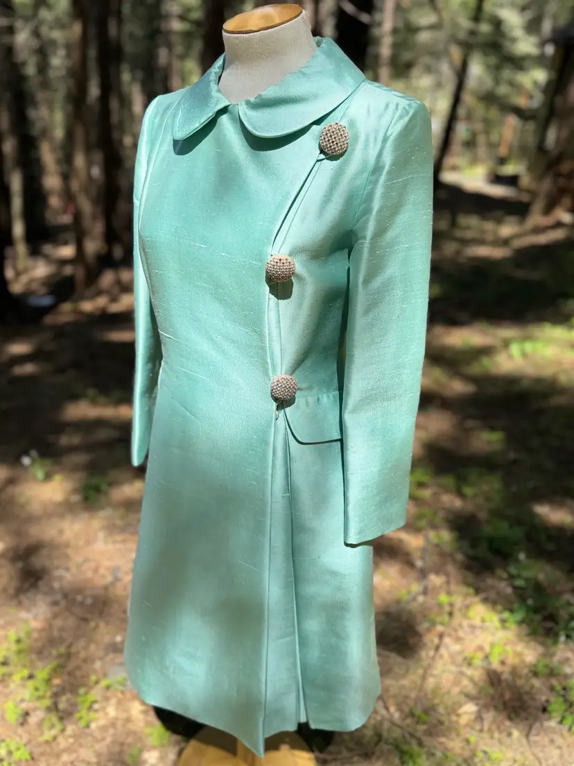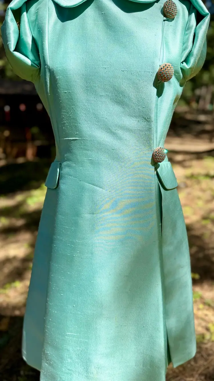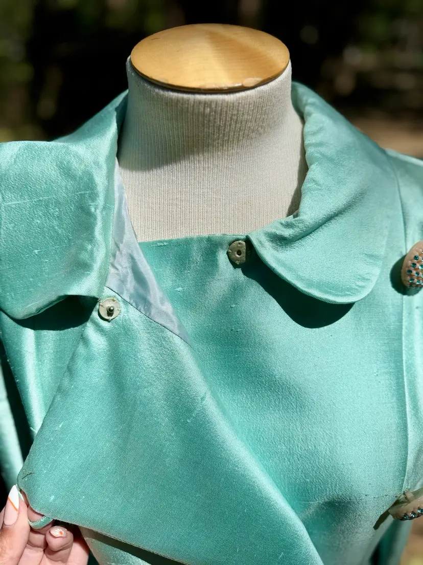 You guys. This beauty is so stunning, I wish pictures did her justice (and she looks great in them!). Peter Pan colar, snatched waist (not the tech term I’m sure, two pockets!! (Hidden behind the faux pocket flaps), three outer buttons, 5 inner snaps to help with shape. WORN ONCE. The story goes that the woman who owned this was gifted it by her husband for their honeymoon, she wore it during said honeymoon, and when she saw that she got it dirty was so embarrassed that she hid it from her husband and never wore it again. 🤷🏽♀️ It has very evidently never been laundered— paper tag is still crisp and new. Have not attempted to get her dry cleaned but I could I suppose.