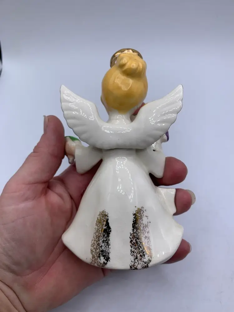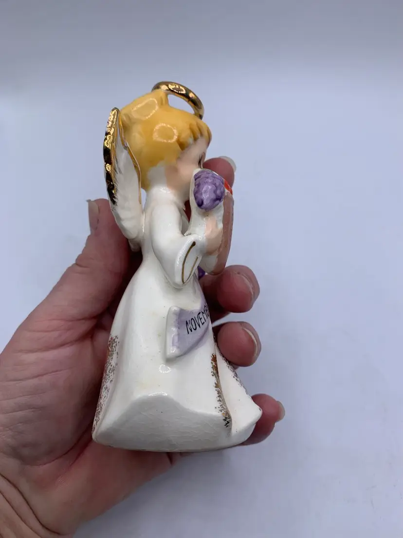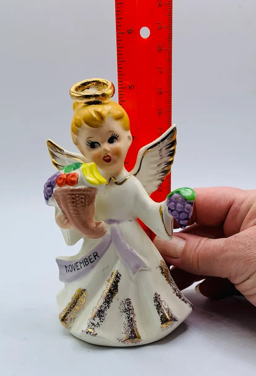 This 1960s vintage ceramic figurine from Japan features an Angel of the Month design with a November theme. Standing at 5 inches tall, this small figurine is a perfect collectible for all occasions, showcasing the charm and style of the 1960s era. Made of ceramic, this figurine captures the essence of the time period and adds a touch of nostalgia to any decor with its angelic beauty and Japanese craftsmanship. Ideal for collectors or anyone seeking a unique and charming piece for their home.