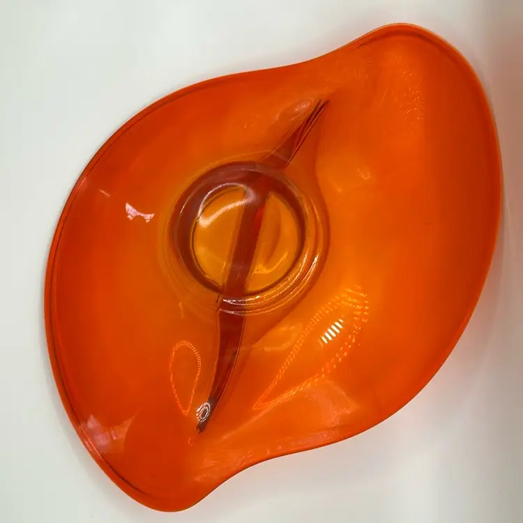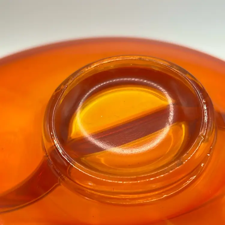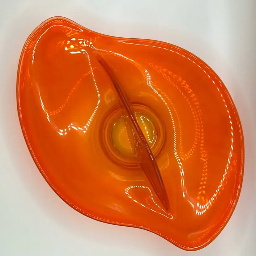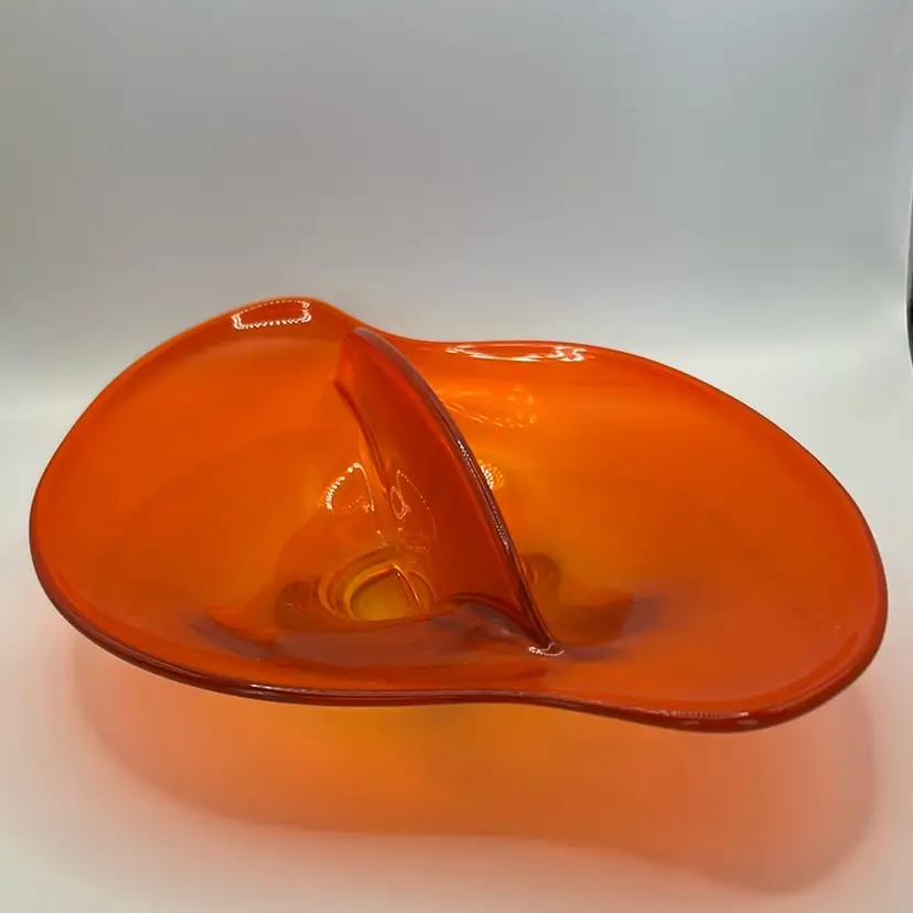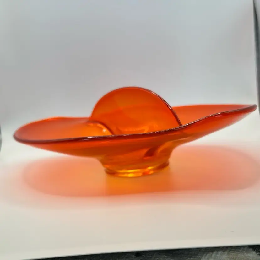 This piece is a vintage mid-century modern Viking art glass dish in a vibrant orange color. It stands one and a half inches tall and 9 inches wide. There are no chips or cracks.