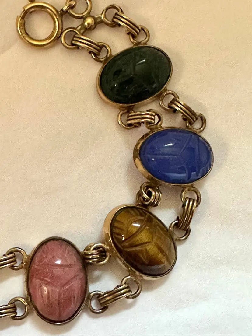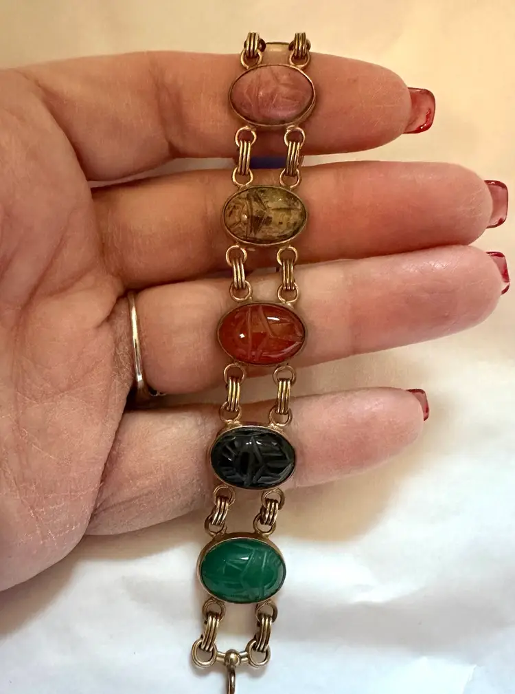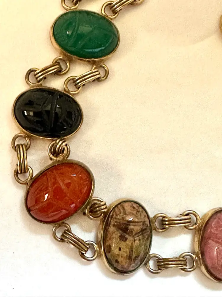Lovely vintage scarab bracelet has 8 semi precious carved stones set in 12k gold filled. It is 7.5” x 1/2”. Very good condition.