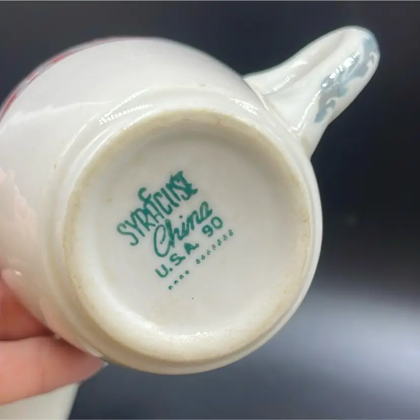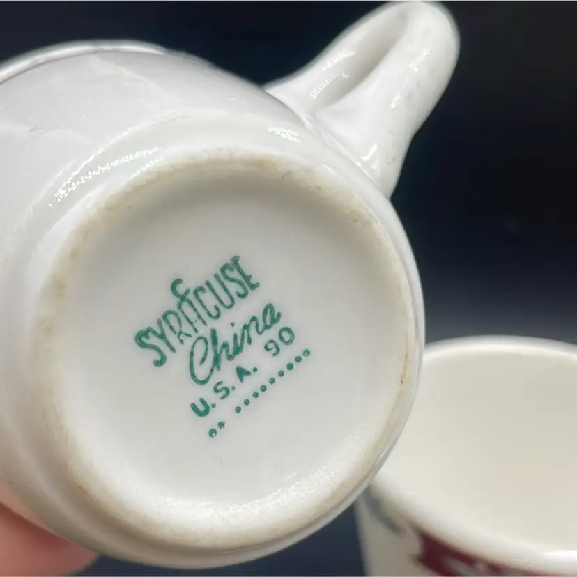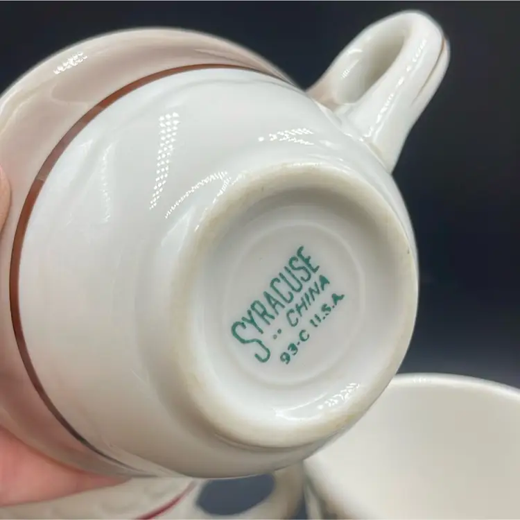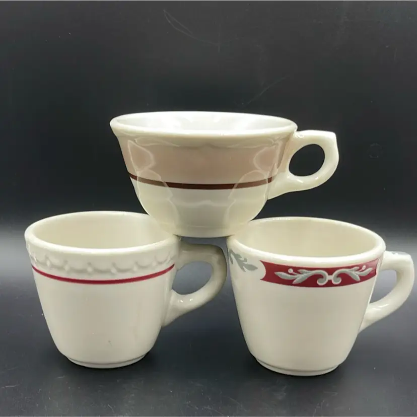 The Syracuse China Company produced collections for home use, railroad use and restaurant use. These are from the restaurant/diner line. You can identify the time period in which they were manufactured based on the codes on the bottom of the cups.