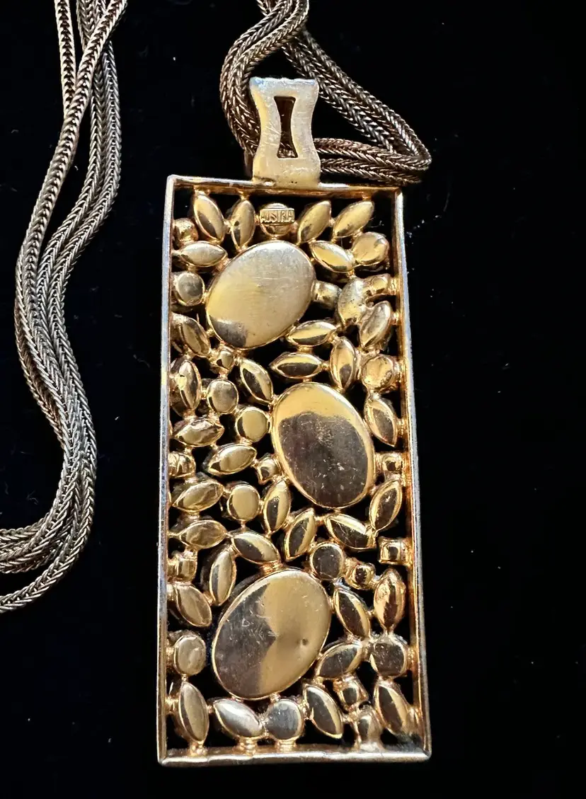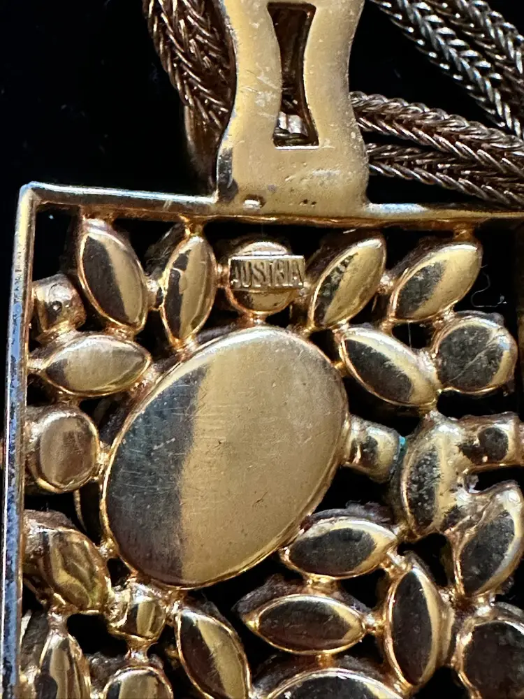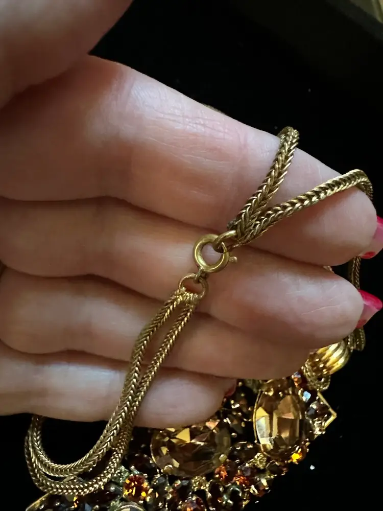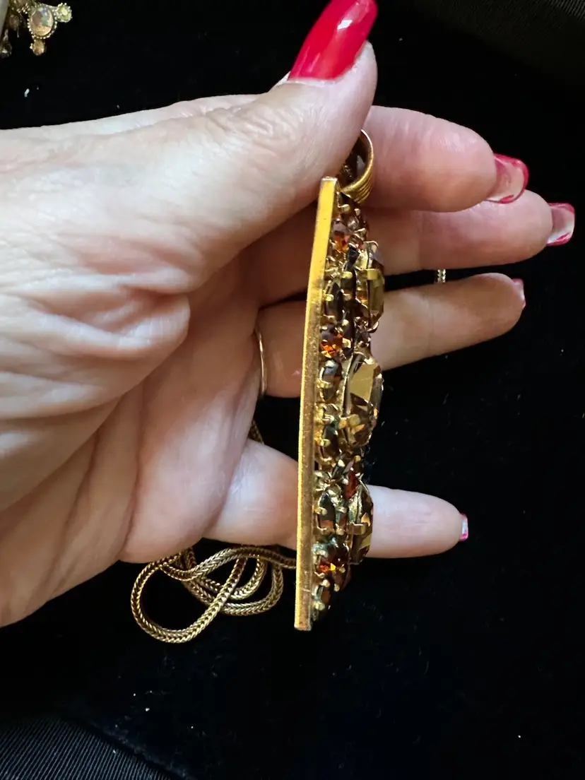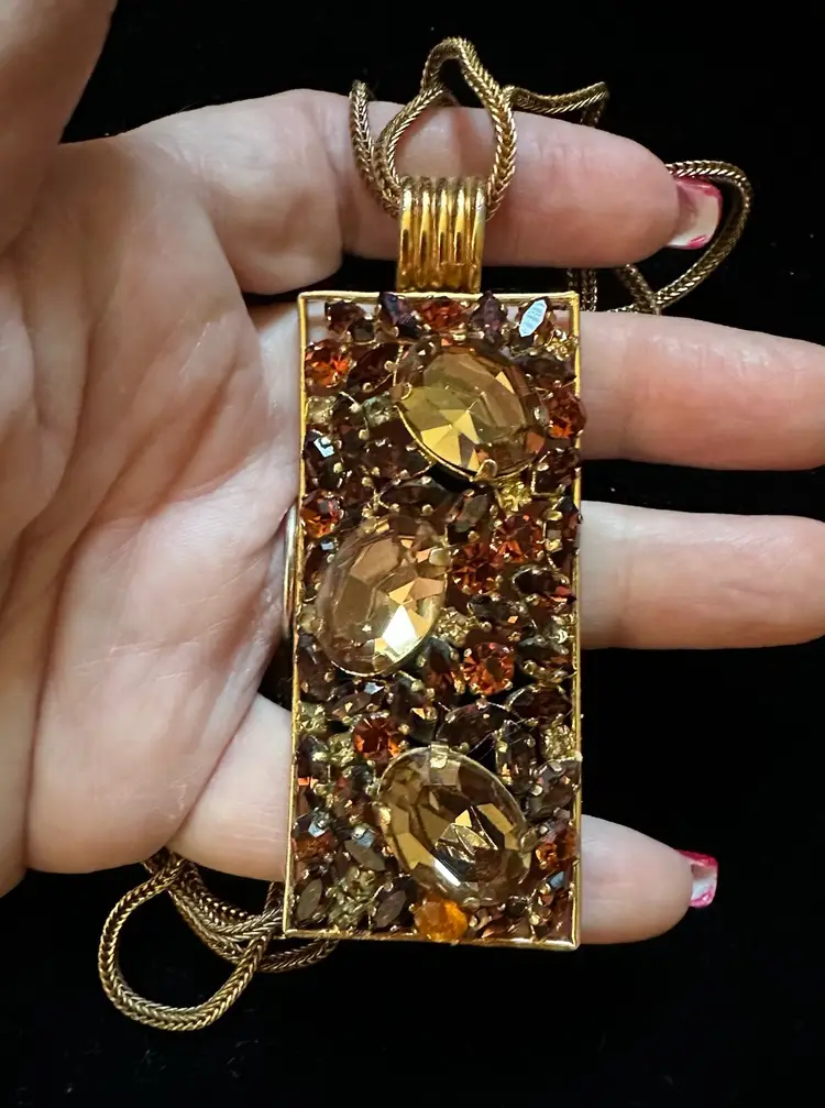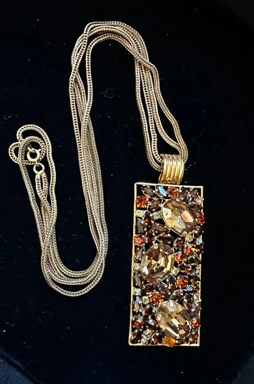 Great looking Austrian crystal pendant necklace in different shades of amber. The pendant is 3 3/8” x 1.25”. It hangs on a double snake link strand. The necklace is 22”. It is in very good condition.