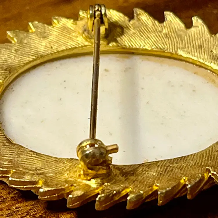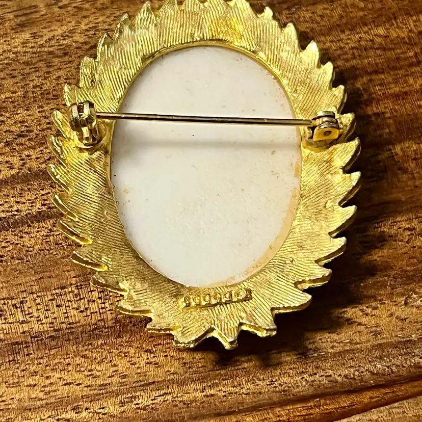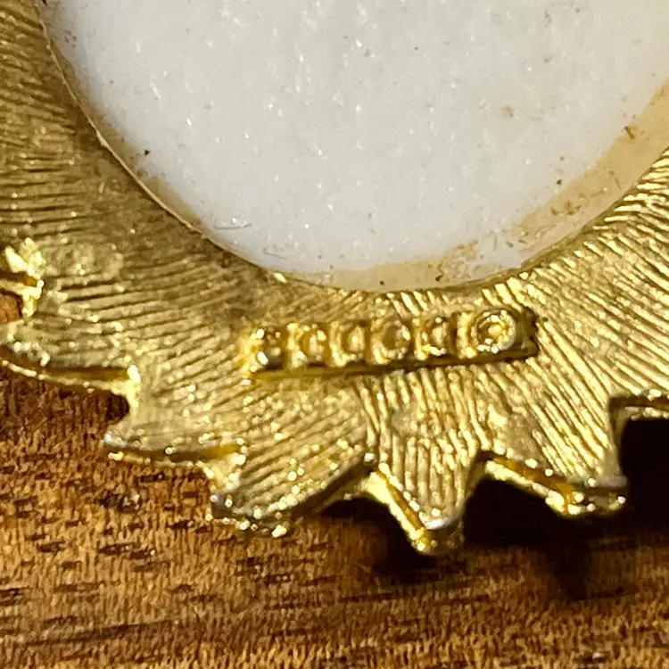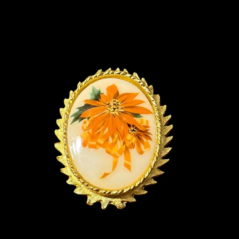 • Designer: William Dodds & Co. (Dodds) • Hallmarks: Signed "DODDS" (Backward/Mirrored) • Period: 1960s • Style: Mid-Century Holiday / Christmas • Closure: Rollover safety pin Condition Great Vintage Condition. The gold-tone finish is vibrant. The cabochon shows clear details and the pin mechanism is sturdy and functional.