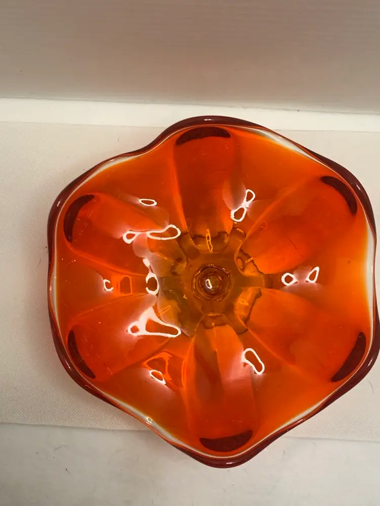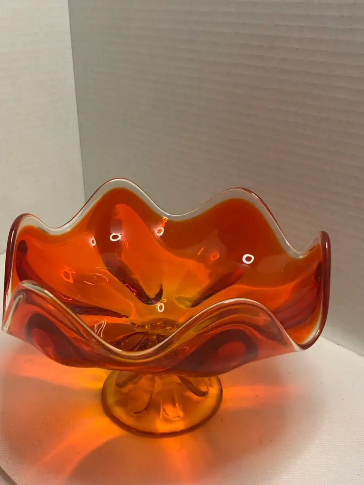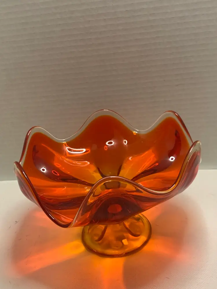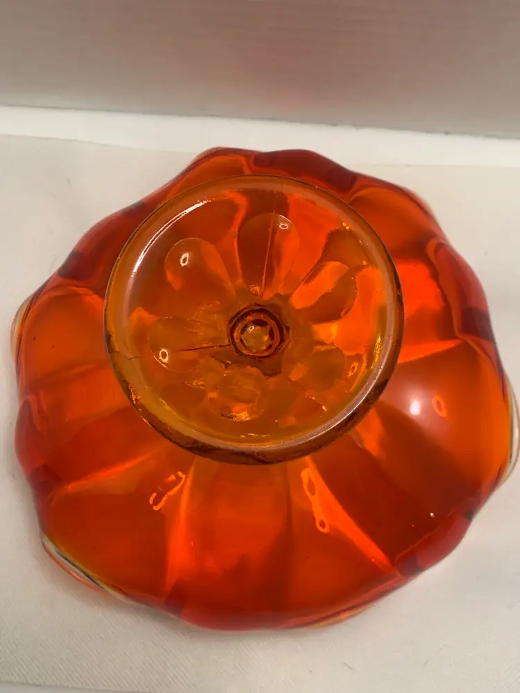 6 pedal pedestal compote persimmon color. Pedestal glows. No chips or cracks. 4.75” tall 7” wide.