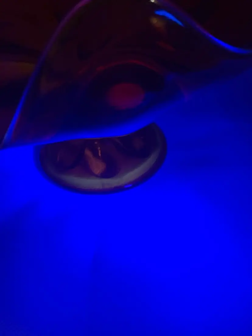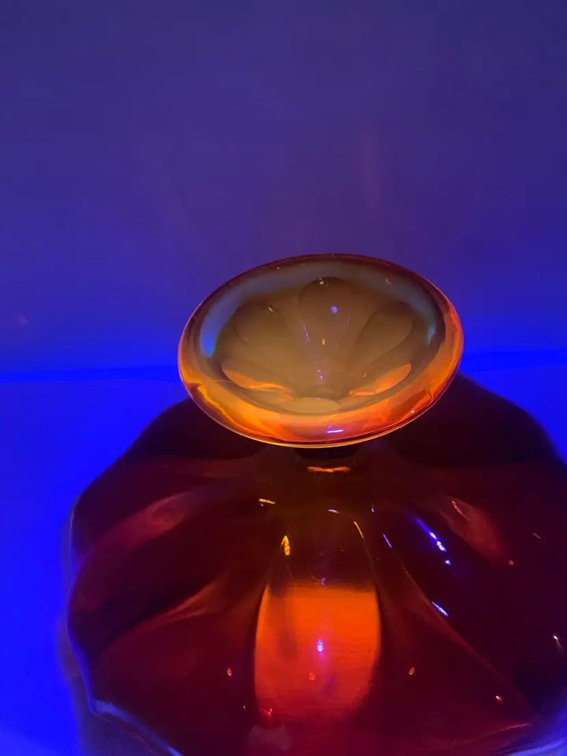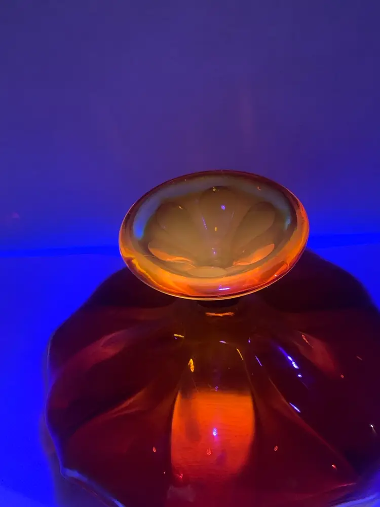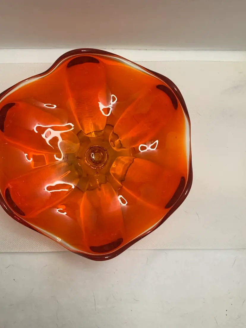 6 pedal pedestal compote persimmon color. Pedestal glows. No chips or cracks. 4.75” tall 7” wide.