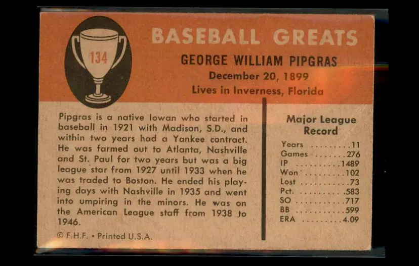 1961 Fleer Baseball Greats (F418-3) #134 George Pipgras - (pk2) - Boston Red Sox