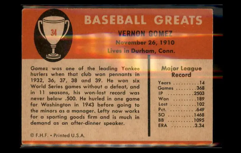 1961 Fleer Baseball Greats (F418-3) #34 Lefty Gomez - (pk2) - New York Yankees