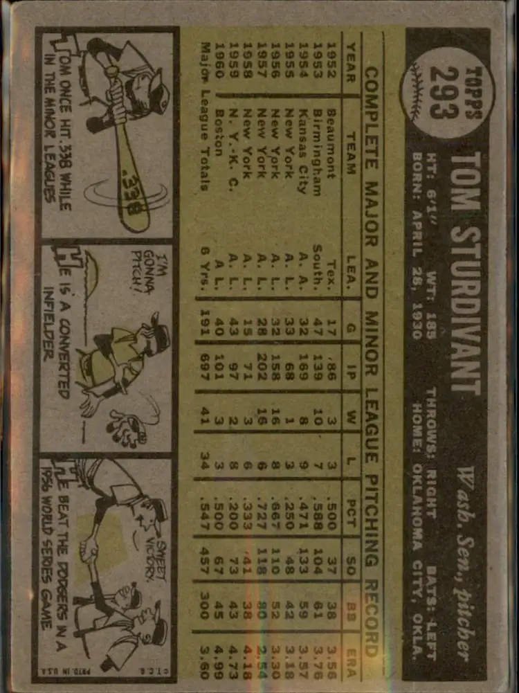 1961 Topps #293 Tom Sturdivant - ( ) - Washington Senators