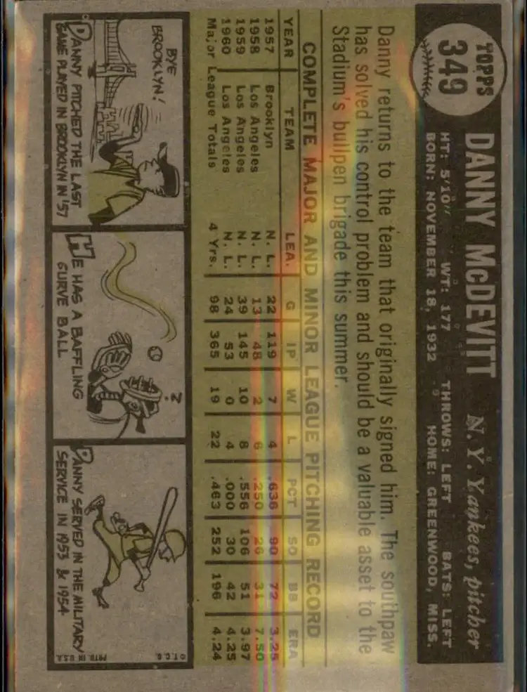 1961 Topps #349 Danny McDevitt - ( ) - New York Yankees
