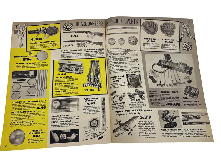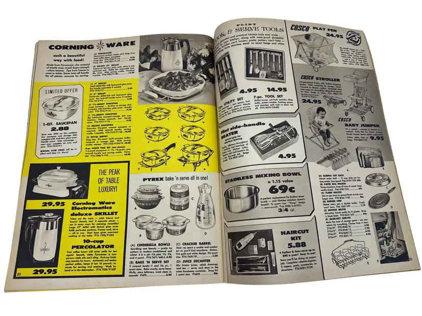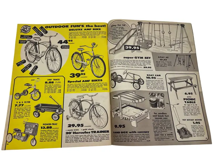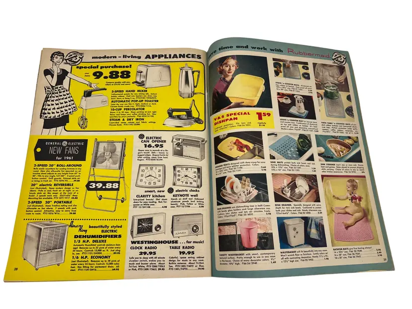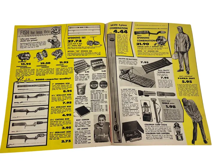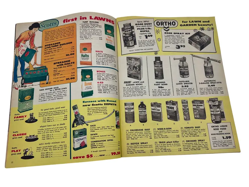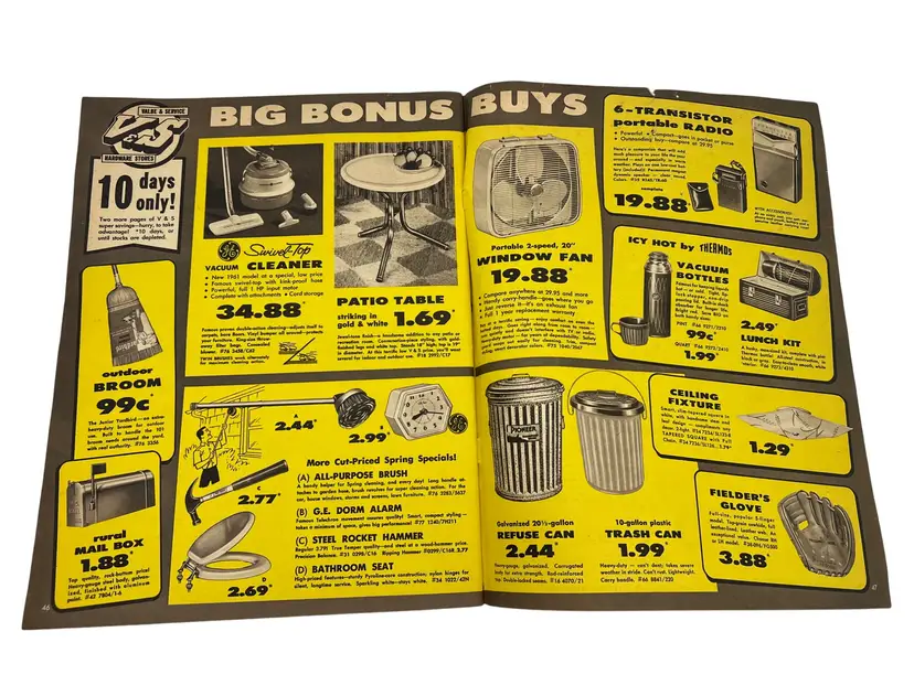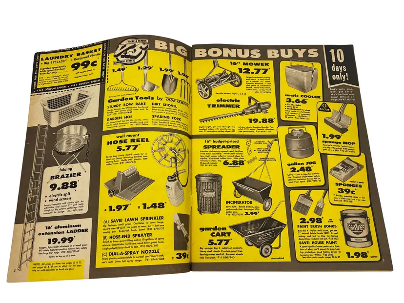 Spring & Summer 1961 V&S (Value & Service) Hardware Stores catalog for Rynbrandt V&S Hdwe. & Lumber, Byron Center, Michigan. Measures about 11" x 8.5" with 47 numbered pages. Bright mid-century graphics and ads for Servess/Briggs mowers, Scotts & Ortho lawn care, Rubbermaid, Corning Ware/Pyrex, Cosco, Coleman, fishing gear, AMF bikes, toys and more. A fun time-capsule reference for advertising, design, and product history.