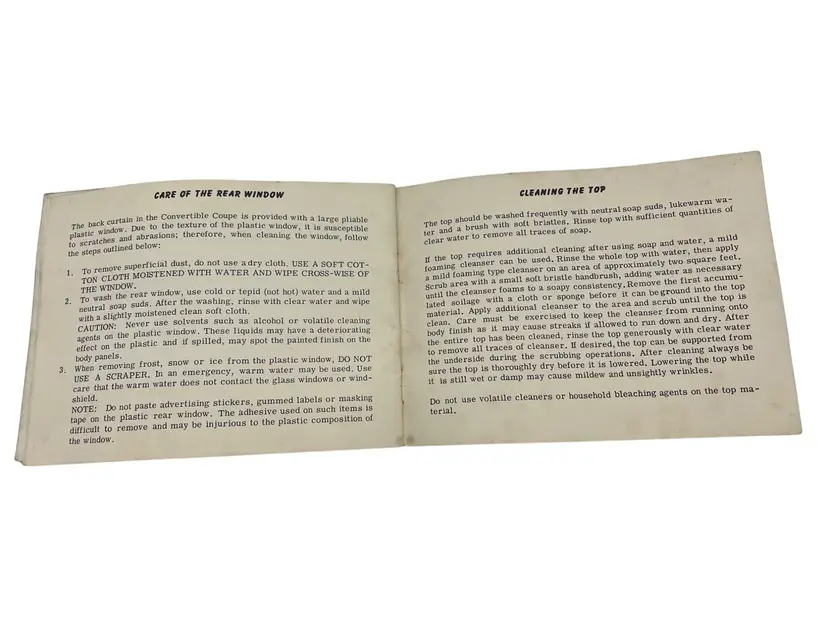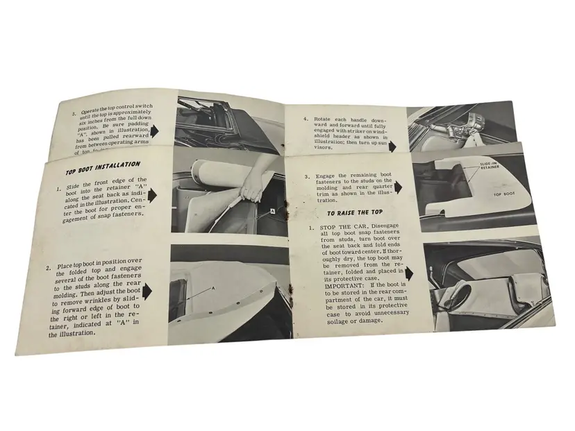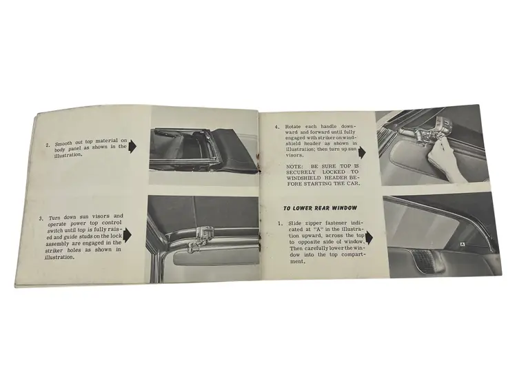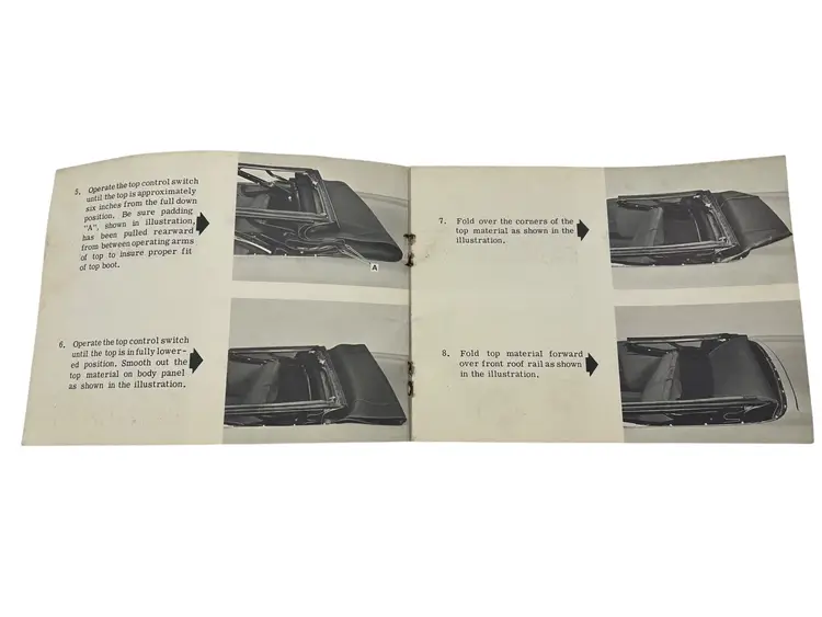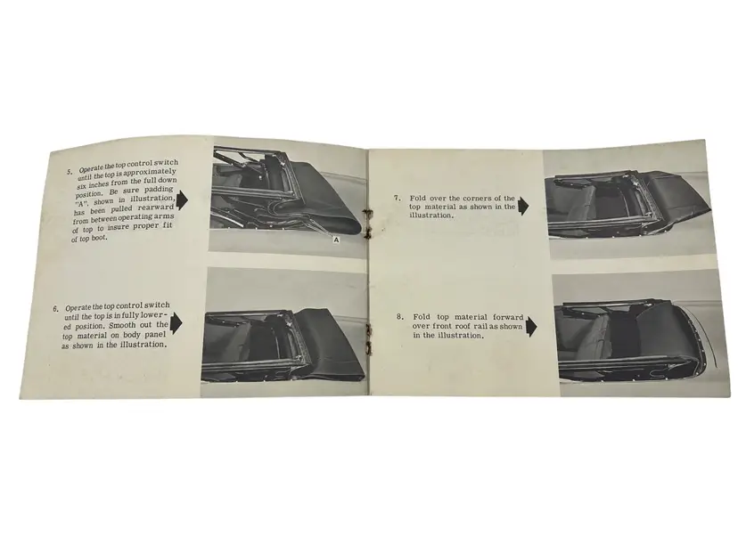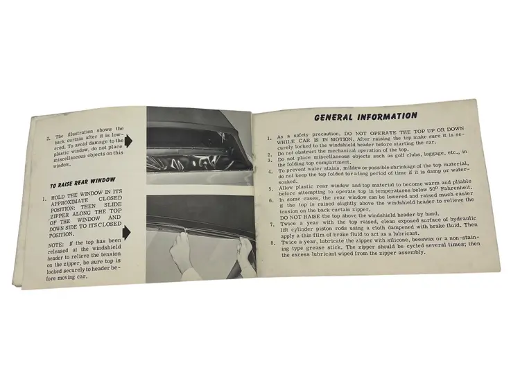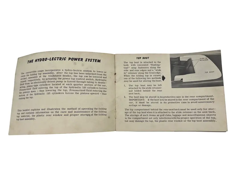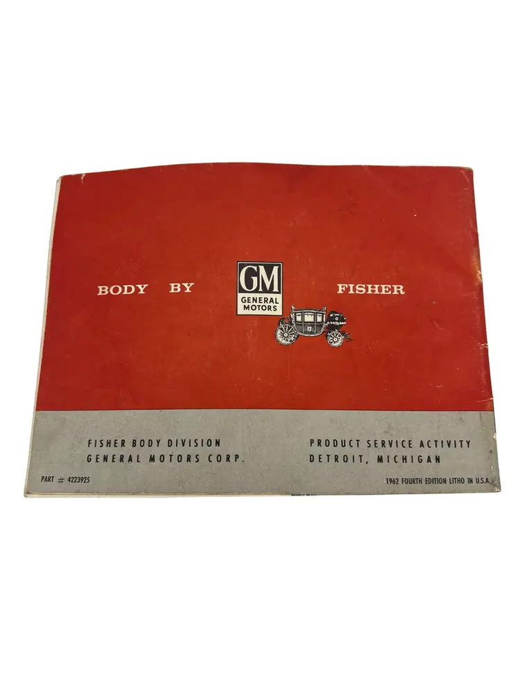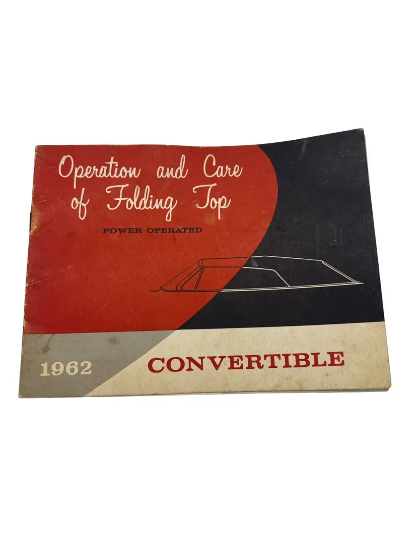 Vintage guide for maintaining, operating, and troubleshooting the 1962 GM Convertible's folding power-operated top system. Original vintage manual from the Fisher Body Division of General Motors Corporation. The booklet measures 6" x 4.5".