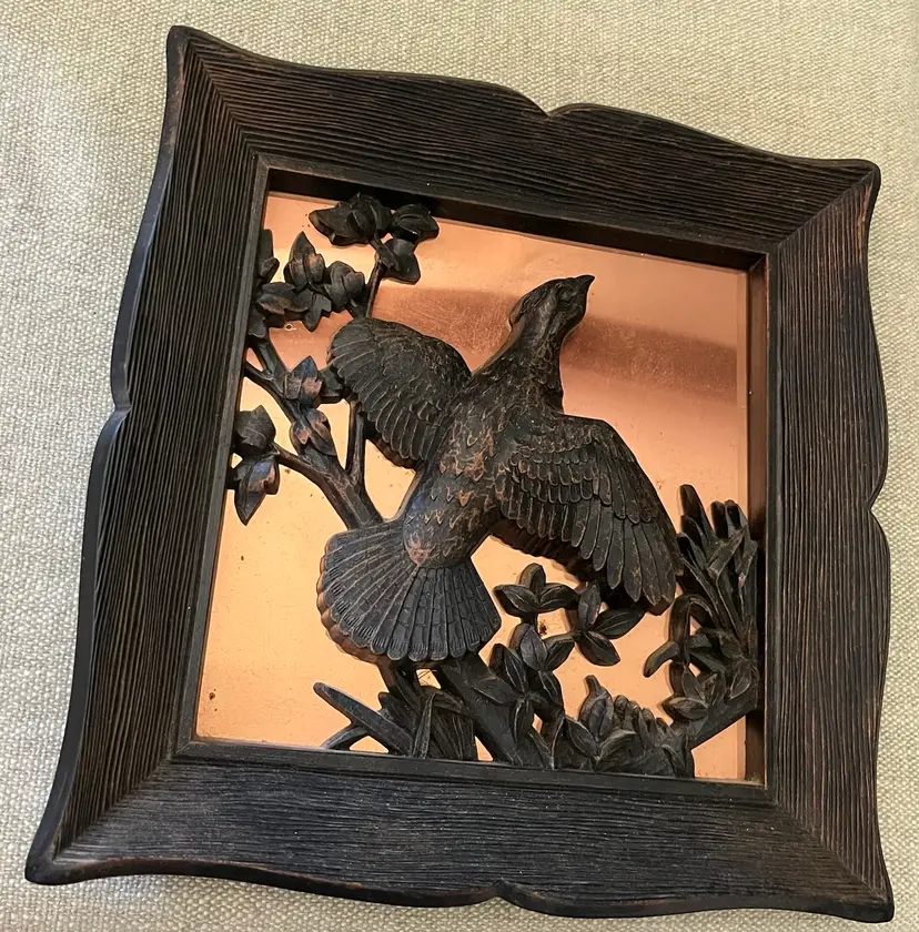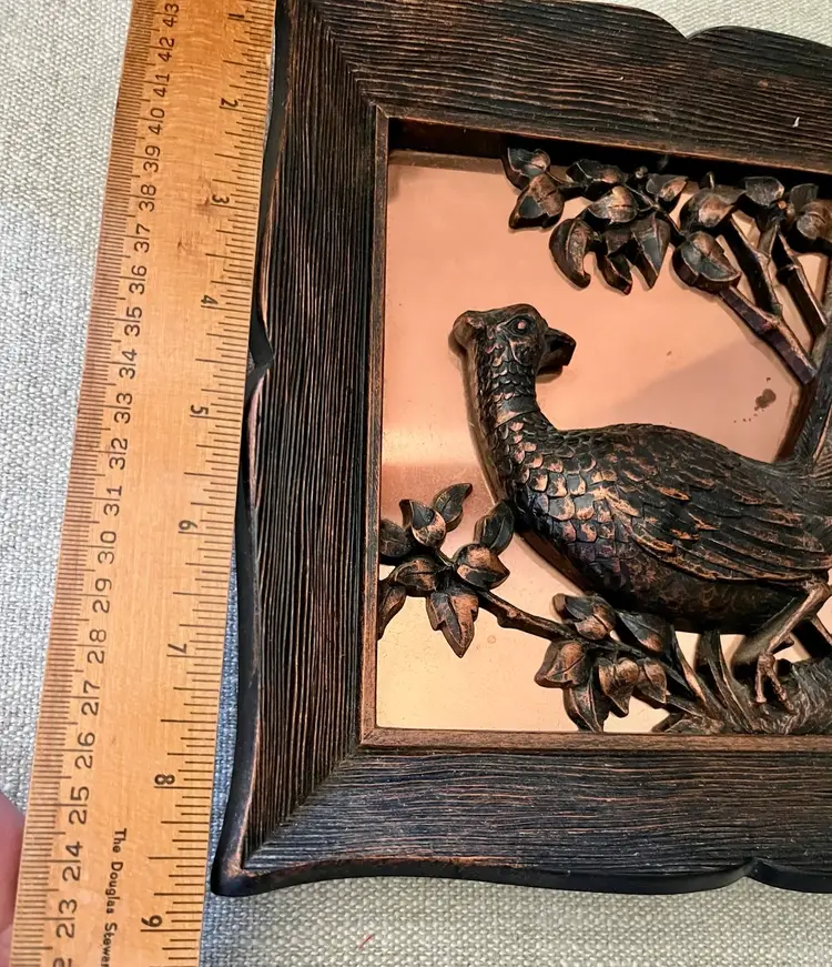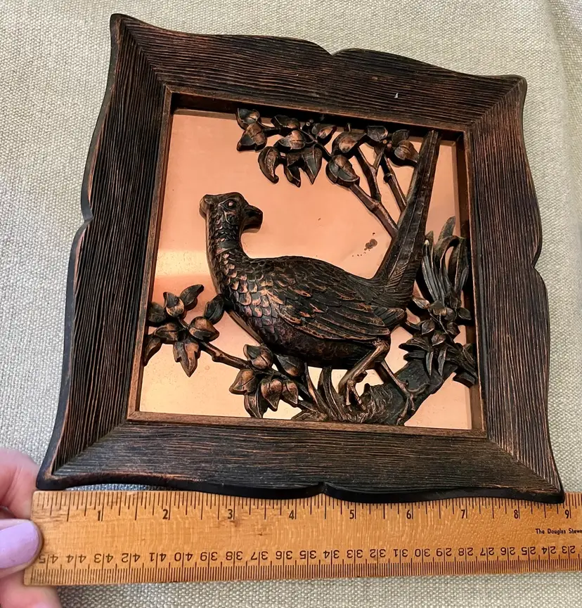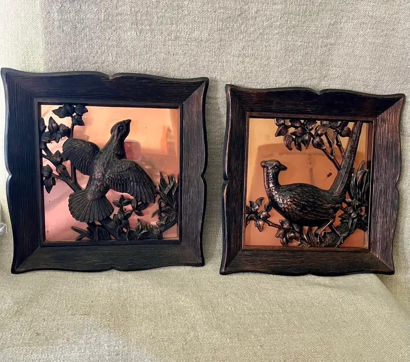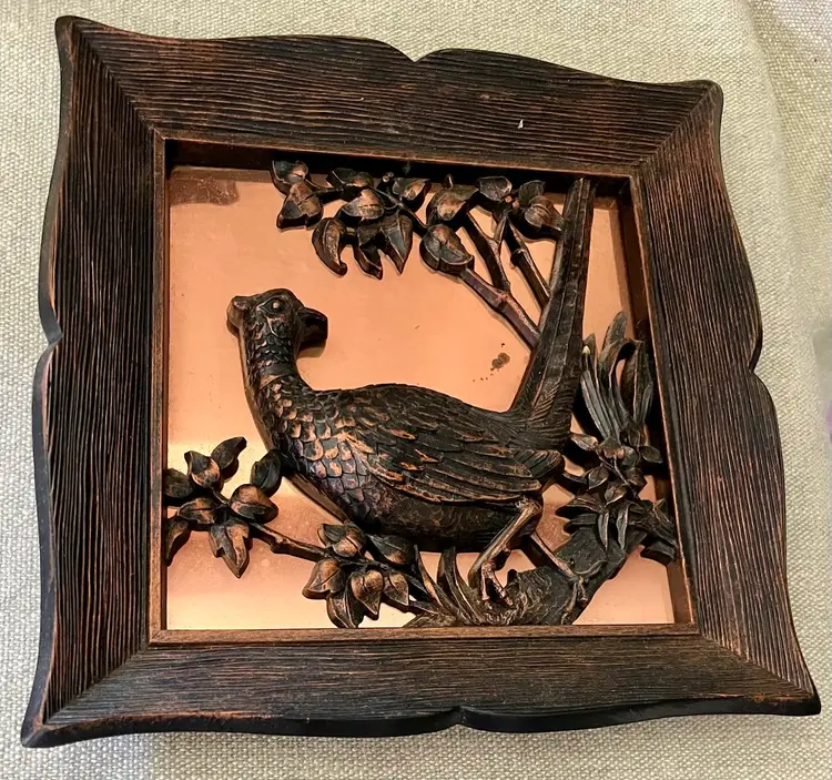 These are vintage MCM 1963 3D framed bird wall art hangings (approximately 9” x 8.75” x 1.5”) created by the Coppercraft Guild in Dart, Indiana, United States. Made of copper and faux wooden frame, these pieces depicts bird game pheasant and quail design, great for lodges, cabins, cottages, sun rooms or enclosed porches, lakeside or riverside rental spaces or Event Centers. With its artisanistry and origin, this wall art pieces are nostalgia from the mid-20th century. These did come from a lakeside A-Frame cottage Estate nearby.