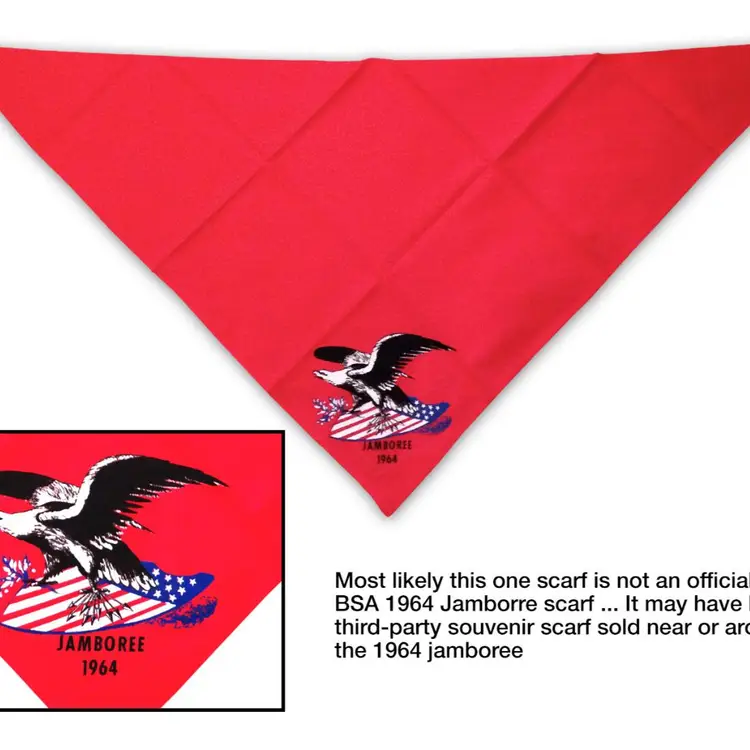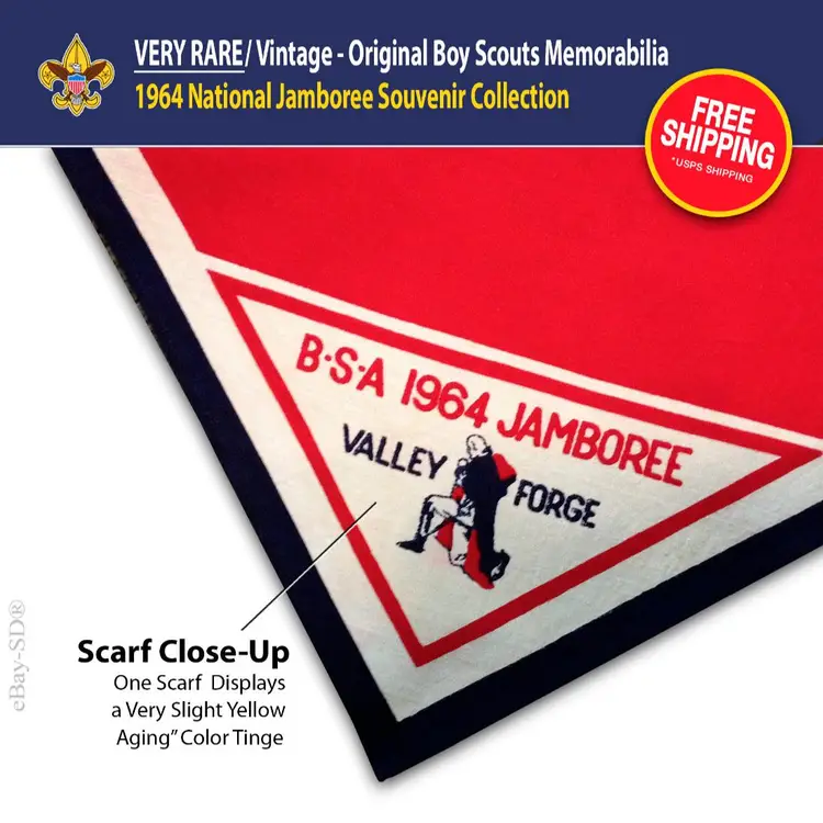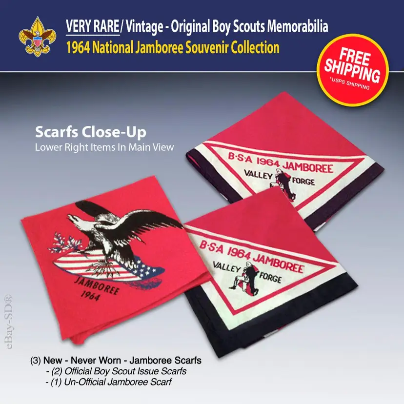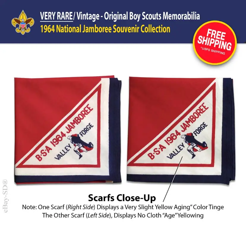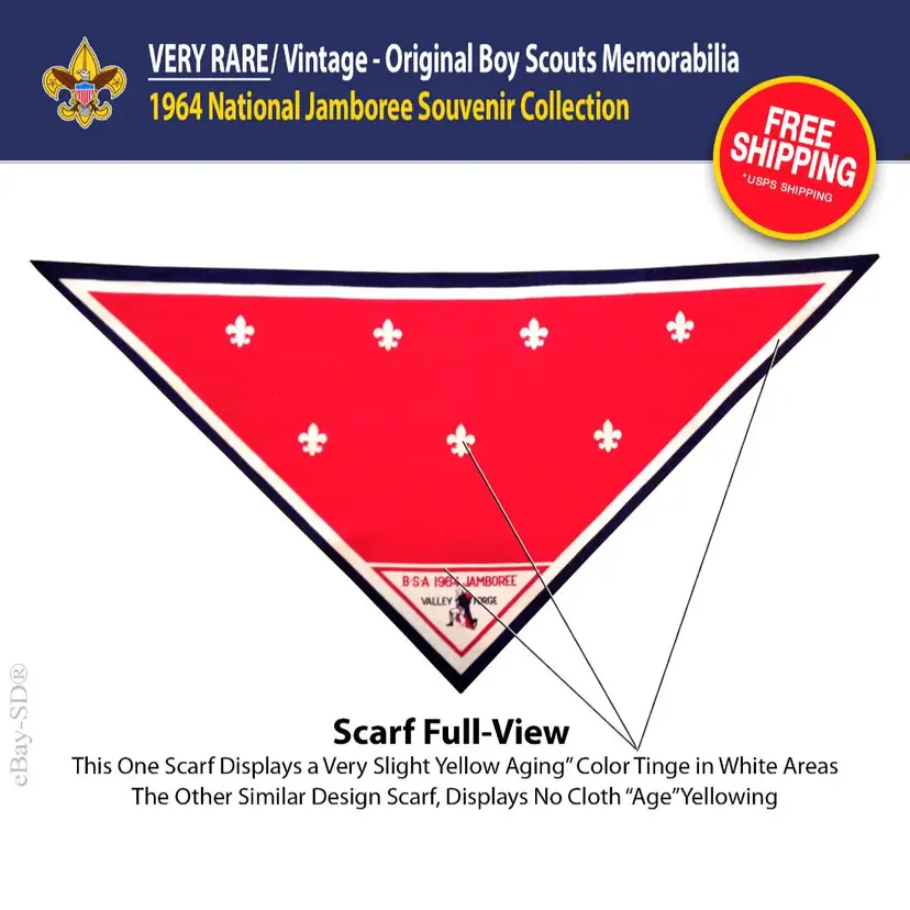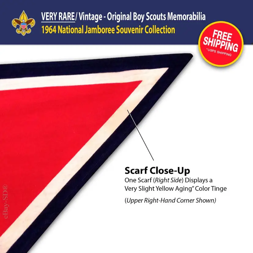 • All items in this 1964 Jamboree Collection are originals (no reproductions). The items are in excellent condition, having been stored (bag sealed), in a dry, moisture-free, smoke-free home environment. Items as described may have only slight "age wear" due to original material natural "aging" over the past 60 years! This "age" wear is particularly evident in one of the scarfs (see photos), where the white areas of the scarf display some very slight yellow tinge (which is hard to show the slight yellow "aging" subtlety in the eBay photos)