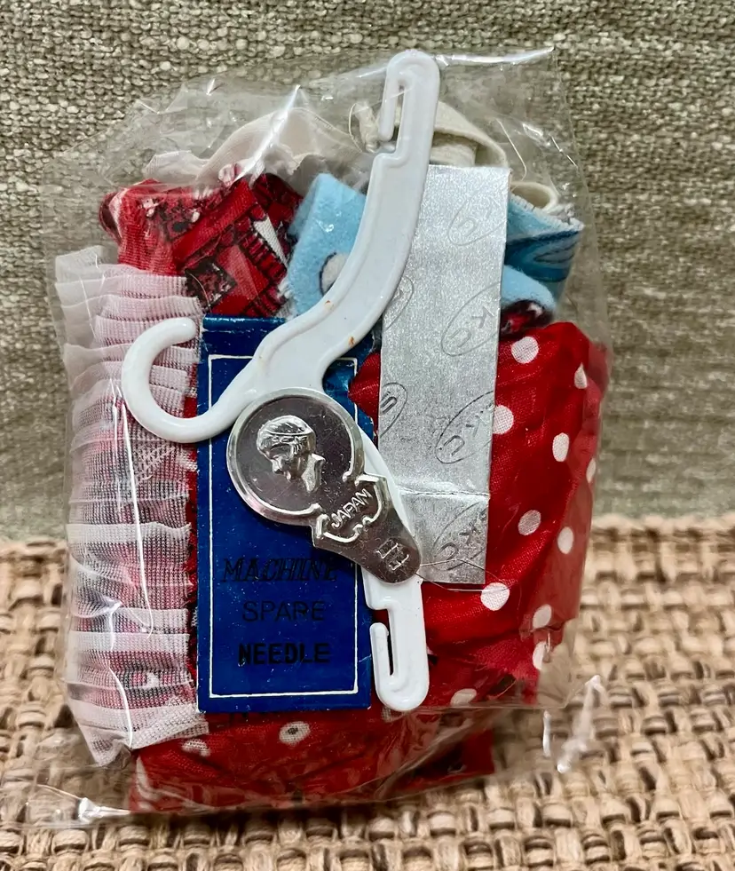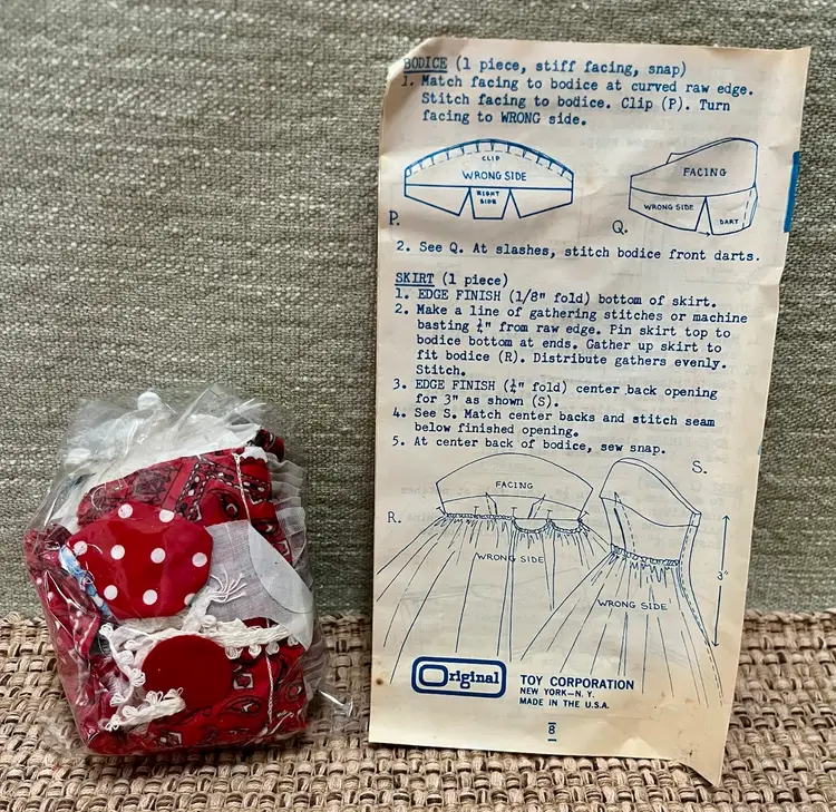 The product is a vintage 1964 Sew Simple Teenage Fashion Doll Wardrobe Primer Instructions booklet tested and approved by the Educational Bureau of Coats & Clark Inc. This booklet provides patterns and instructions for creating doll wardrobes of a Holiday Dress, Pajamas set of cover and panty, Sweet Sixteen Gown, focusing on teenage fashion trends of the time. Additionally, the original fabric scraps and doll clothes hanger. Made in the United States, this original vintage piece is a collectible ephemeral item. A living estate piece, the original owner requested us to list on her behalf.