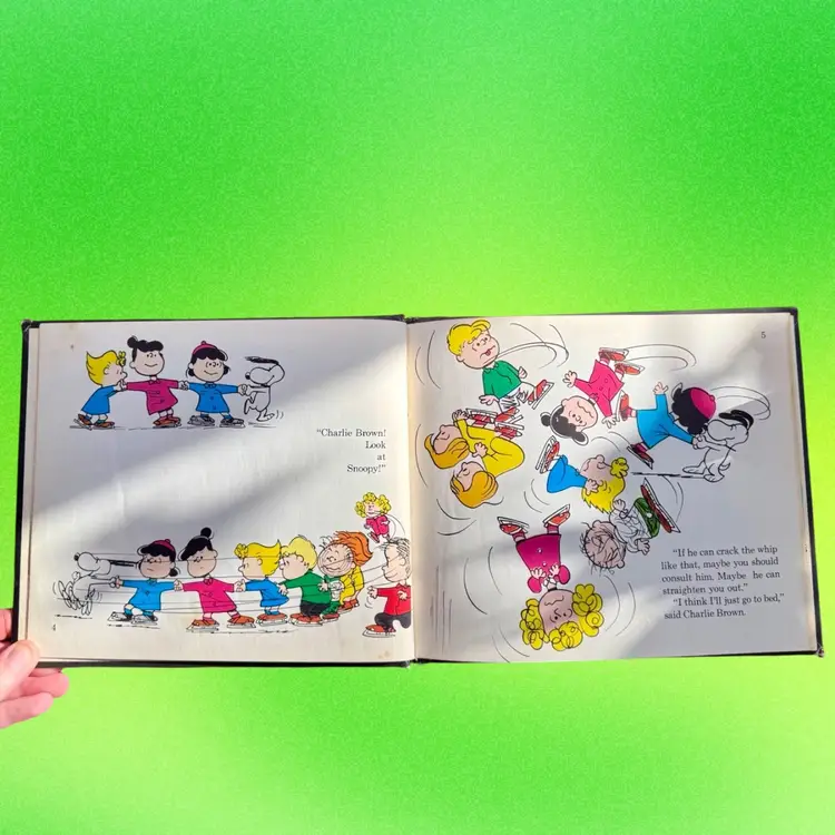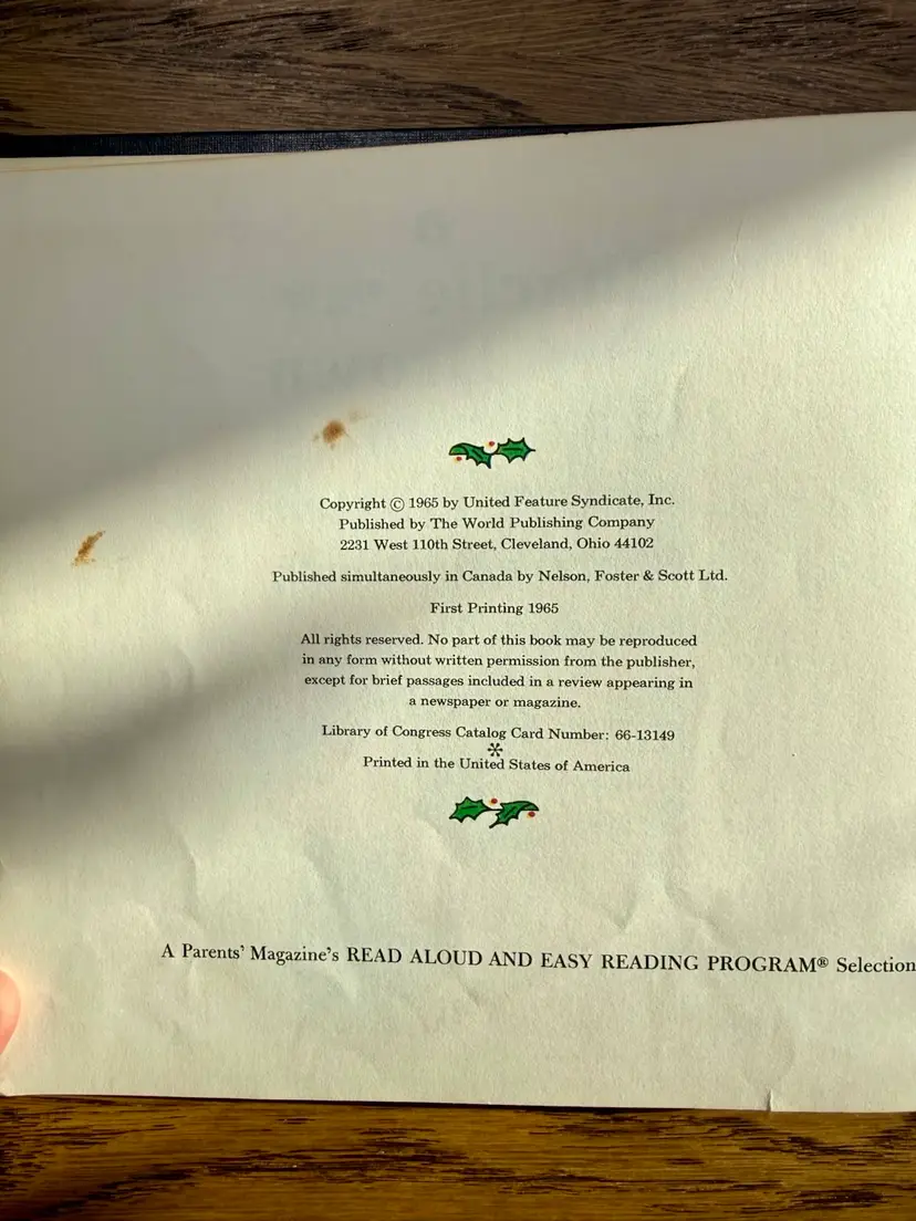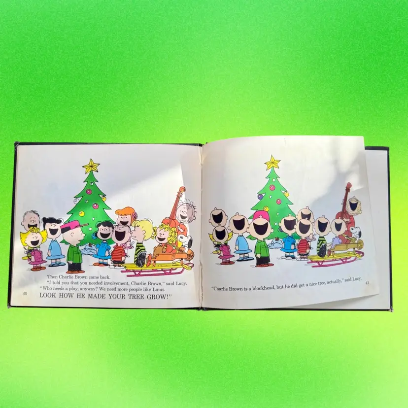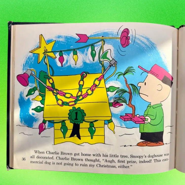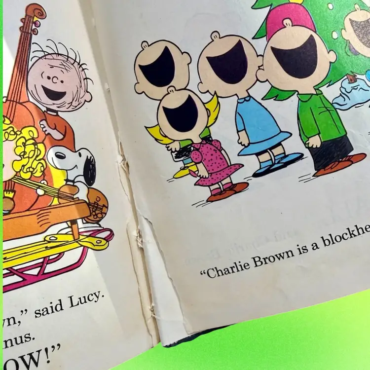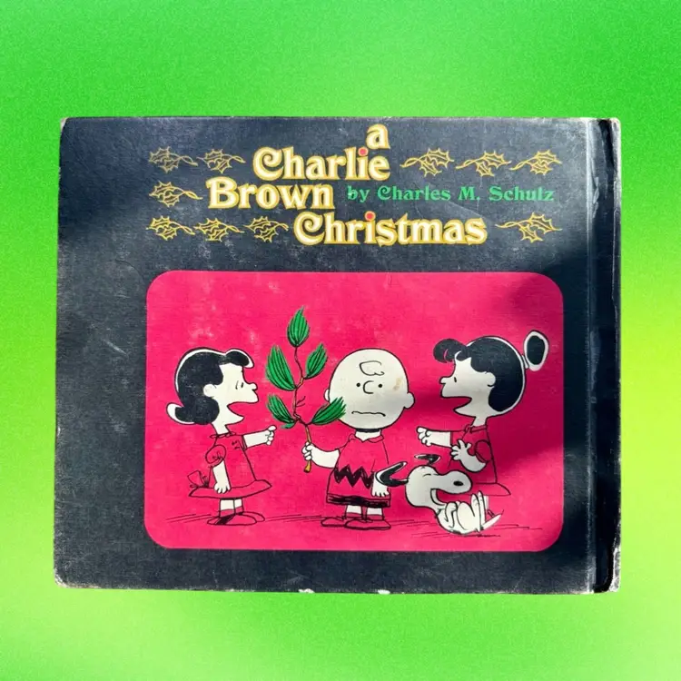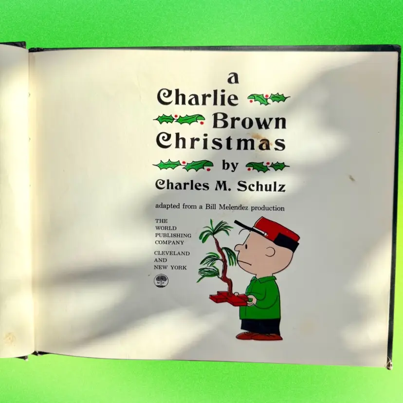 9"x7.5". 1965 first printing, A CHARLIE BROWN CHRISTMAS Hardcover book. Structural condition is in pretty good used/vintage condition overall. Book does have some wear, however. Book cover has some scuffs/discoloration, a ring stain from a cup, and a small piece of tape stuck to it. Some pages may have some small brown stains. Last page has a tear at the binding. Please look at photos thoroughly. Does NOT include dust jacket.