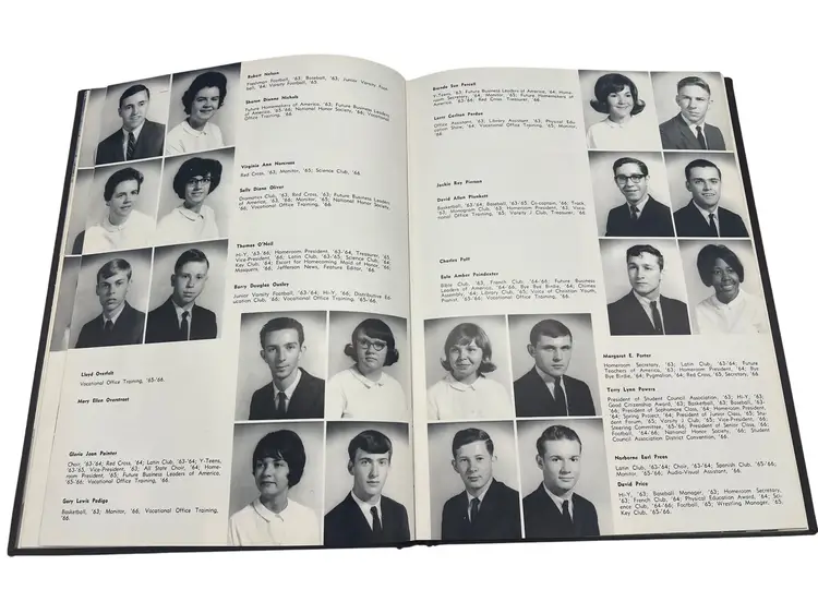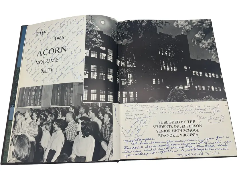1966 The Acorn yearbook from Jefferson Senior High School (Roanoke, VA). Hardcover, 10.75″ × 8″, 144 pages. Contains the senior year of the first African-American student to graduate after integration, was previously owned by a student-teacher, and includes two original sheets of paper found inside. Ink inscriptions present. Excellent historical and local significance for collectors and historians.