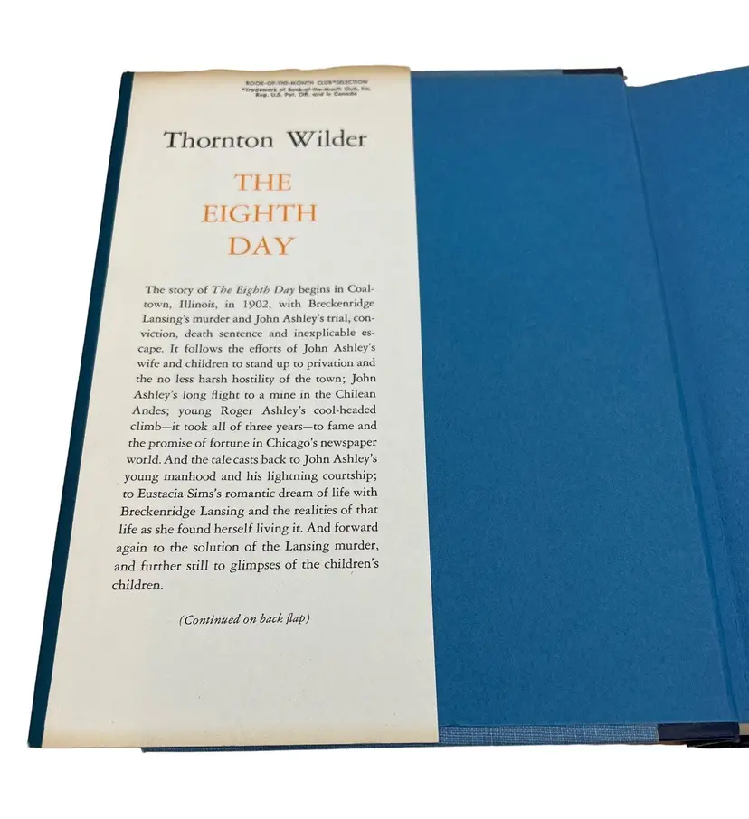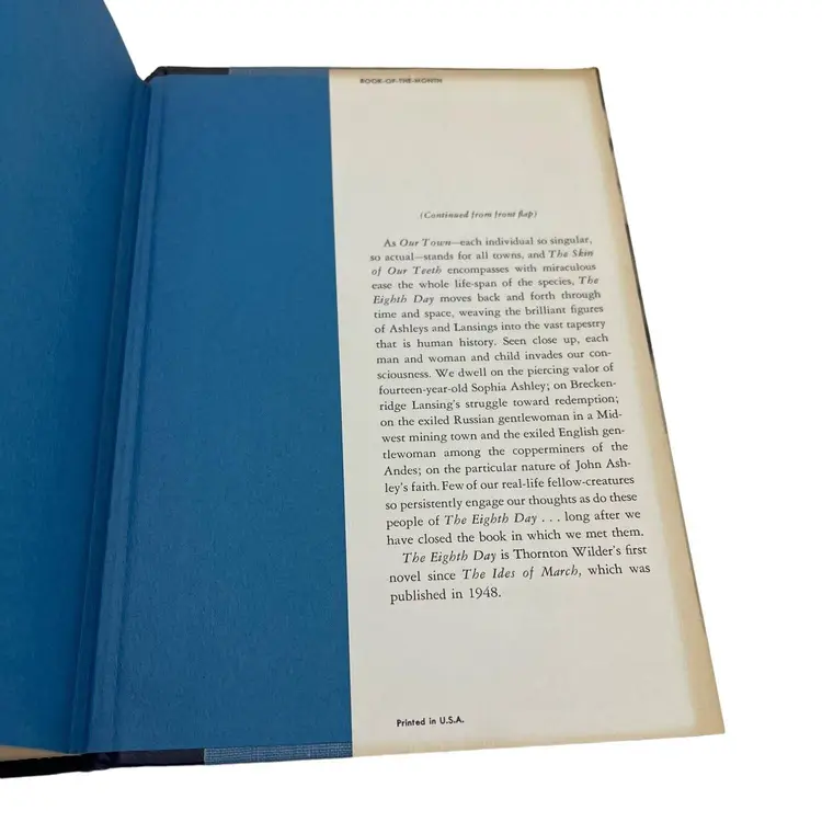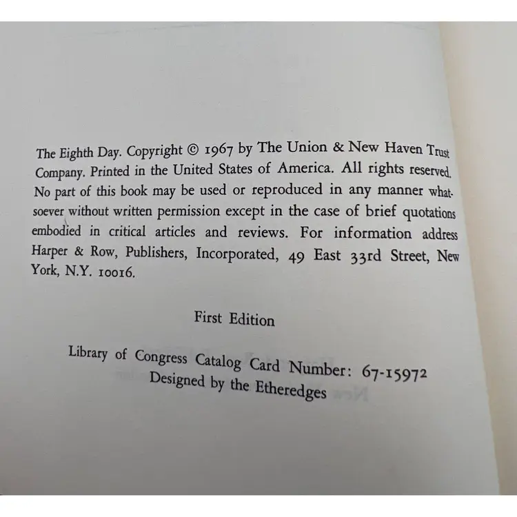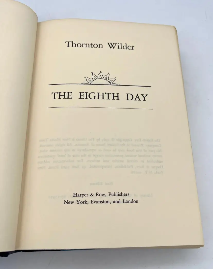 Features: • Book Title: The Eighth Day • Author: Thornton Wilder • Publisher: Harper & Row • Year Published: 1967 • Edition: First Edition • Type: Hardback • Dust Jacket: Yes • Numbered Pages: 435 • Size: 8.5" x 5.75" • Printed In: USA • ISBN: n/a