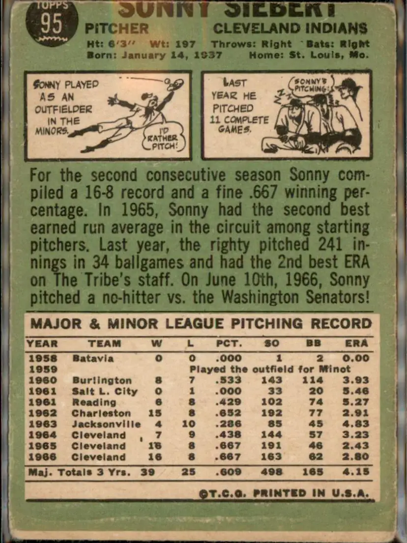 1967 Topps #95 Sonny Siebert - (pk3) - Cleveland Indians
