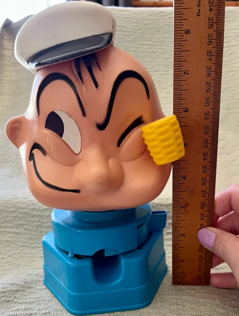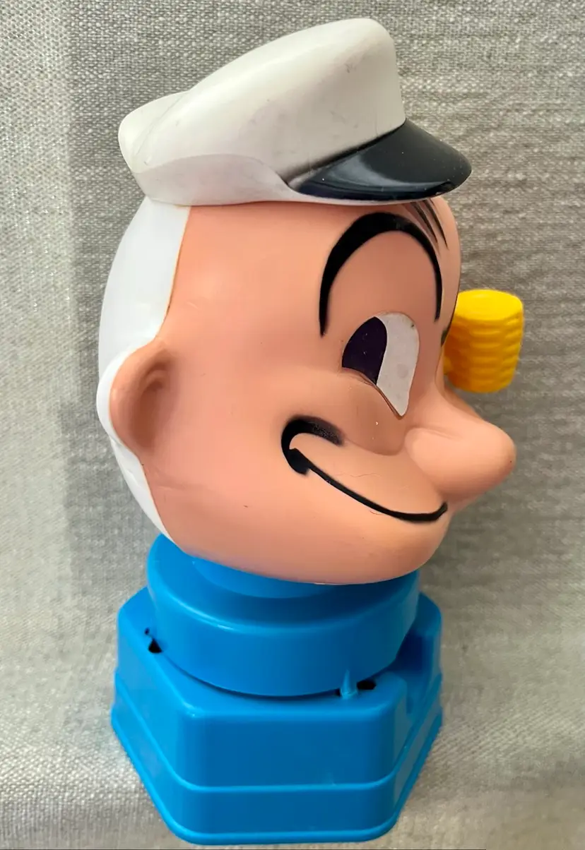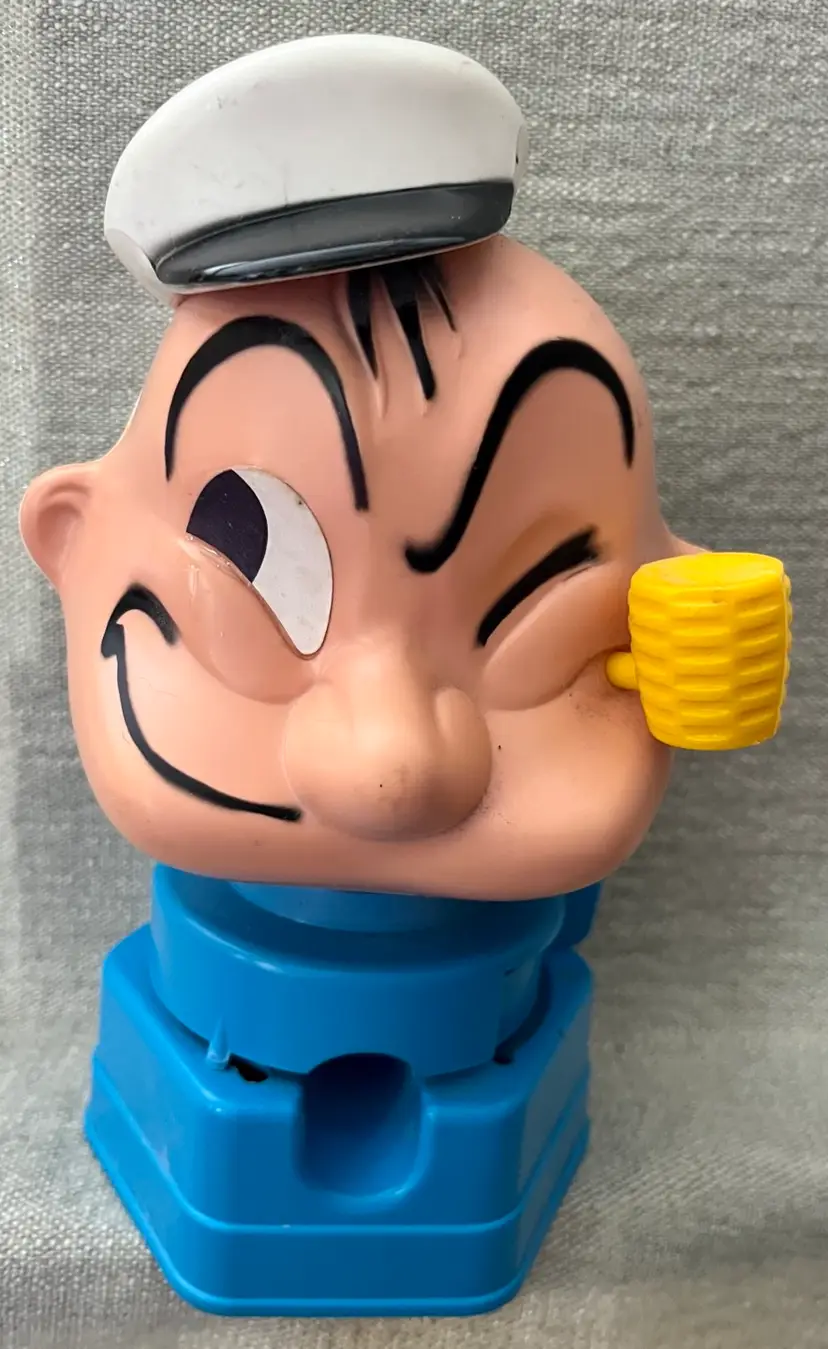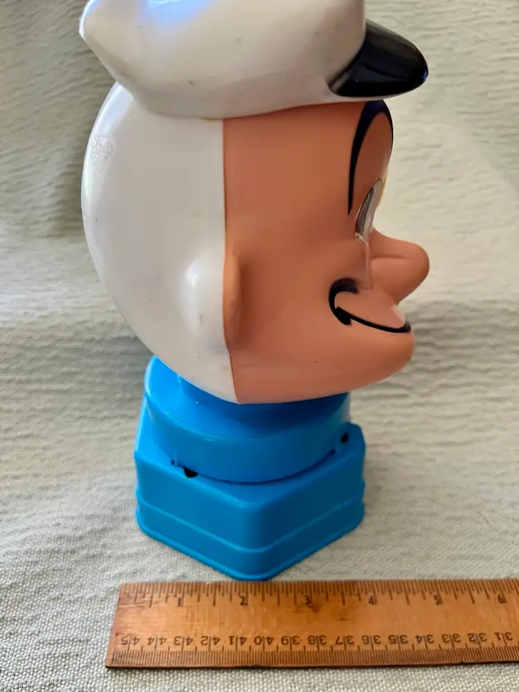The 1968 Hasbro Plastic Popeye the Sailor Bubble Gum Ball Machine Dispenser is a vintage collectible featuring the beloved cartoon character Popeye. Made of plastic and stamped K.F.S. as in the King Features Syndicate, this original Hasbro product from the 1960s stands at between 8” - 9” tall and is a valued addition to any collection of cartoon memorabilia. With its authentic age of scuffs, scratches, and reapplied with clear glue eye, this dispenser captures the charm and nostalgia of Popeye the Sailor Man in a fun and whimsical way. This weighs (without shipping packaging) 7.6 ounces.