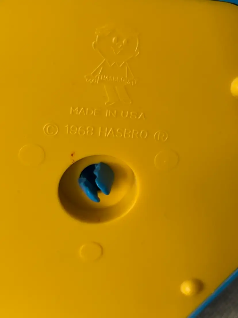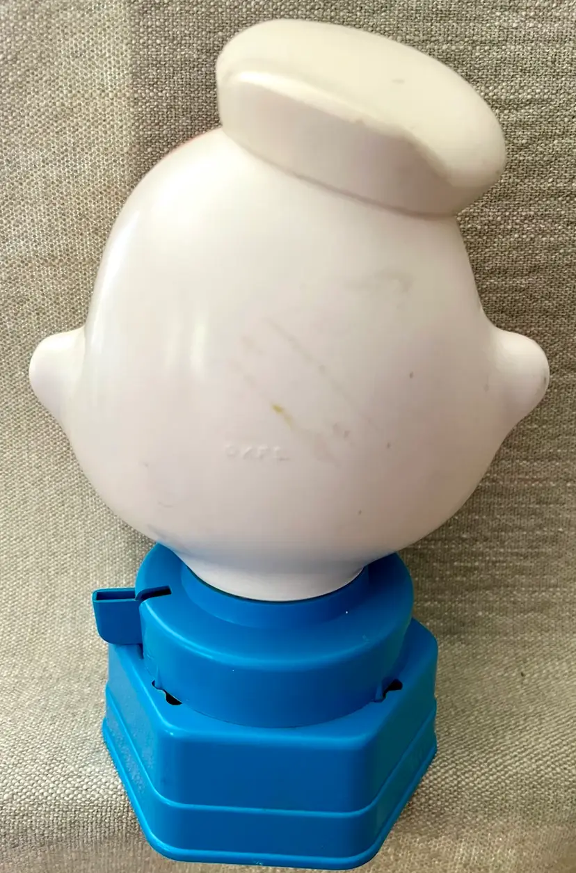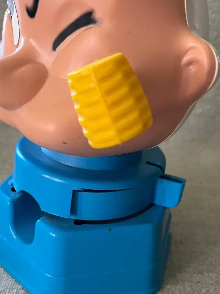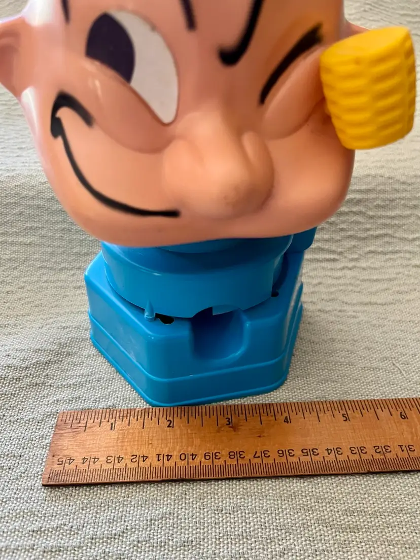The 1968 Hasbro Plastic Popeye the Sailor Bubble Gum Ball Machine Dispenser is a vintage collectible featuring the beloved cartoon character Popeye. Made of plastic and stamped K.F.S. as in the King Features Syndicate, this original Hasbro product from the 1960s stands at between 8” - 9” tall and is a valued addition to any collection of cartoon memorabilia. With its authentic age of scuffs, scratches, and reapplied with clear glue eye, this dispenser captures the charm and nostalgia of Popeye the Sailor Man in a fun and whimsical way. This weighs (without shipping packaging) 7.6 ounces.