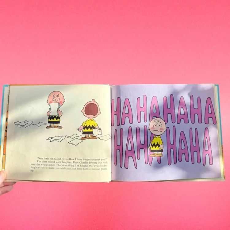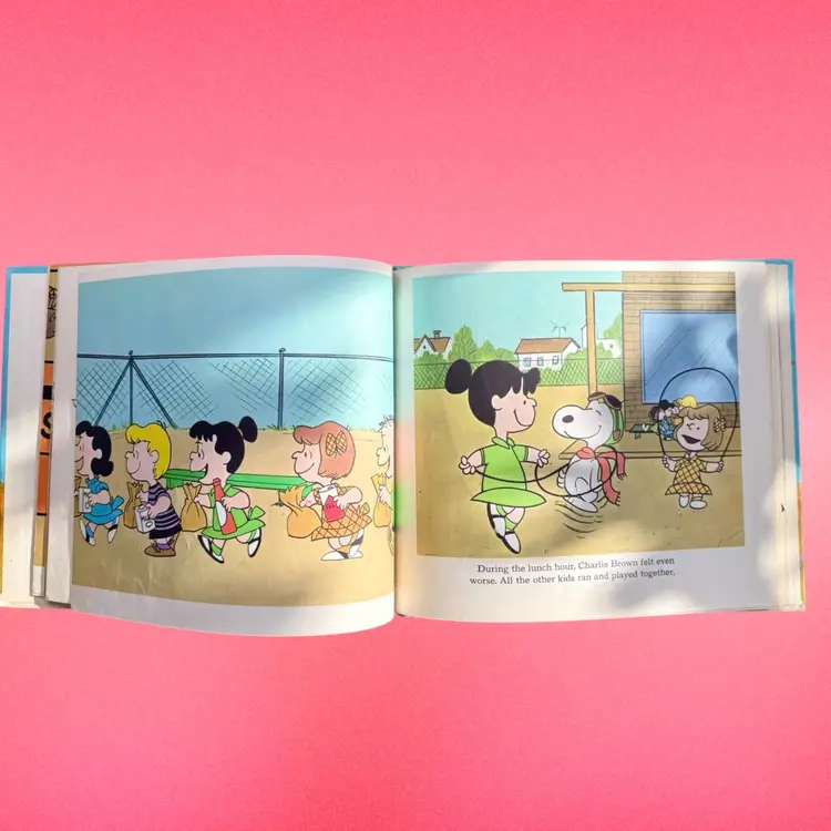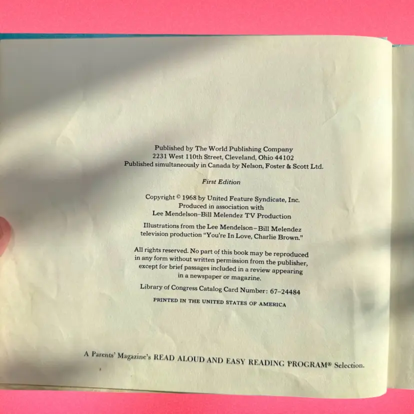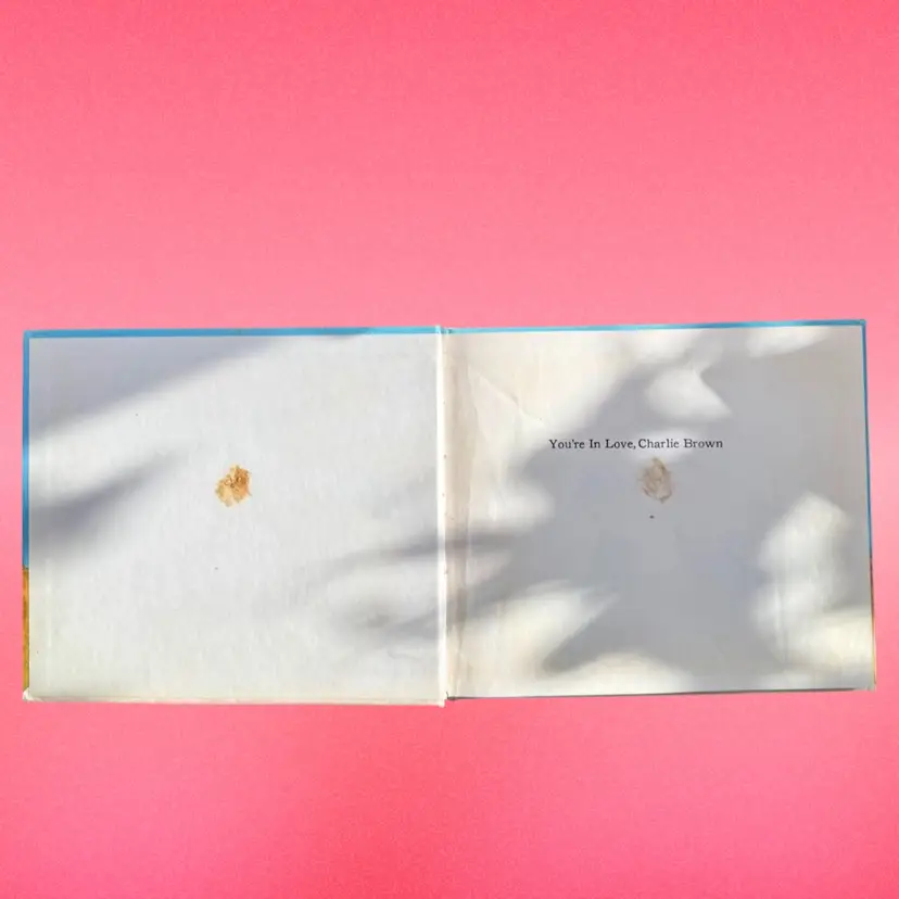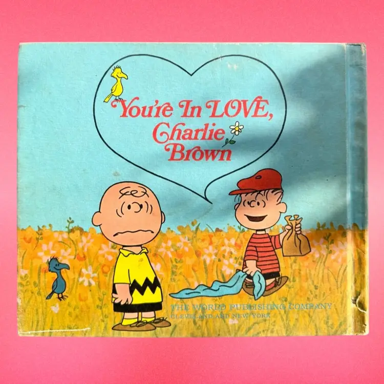 9"x7.5". 1968 first edition, YOU’RE IN LOVE, CHARLIE BROWN! Hardcover book. Structural condition is in good used/vintage condition overall. Book cover has wear consistent with age, including scuffs/discoloration. Some pages may have some spots of brown staining and some wrinkling. Overall it’s in good used condition! Please look at photos thoroughly. Does NOT include dust jacket.