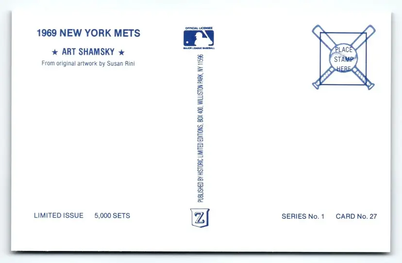 Unit of Sale: Single Unit Artist: Susan Rini Occasion: Baseball Signed: Yes Size: Standard (5.5 x 3.5 in) Year Manufactured: 1969 Material: Paper Original/Licensed Reprint: Original Brand/Publisher: Historic Limited Editions Subject: Baseball Type: Printed (Lithograph) Unit Type: Unit Era: Chrome (c. 1939-present) Theme: Sports, New York Mets, Mets, Baseball Postcard, Rini, NY Mets, Limited Edition, Shea Stadium Featured Refinements: Baseball Postcard Time Period Manufactured: 1960-1969 Country/Region of Manufacture: United States Postage Condition: Unposted
