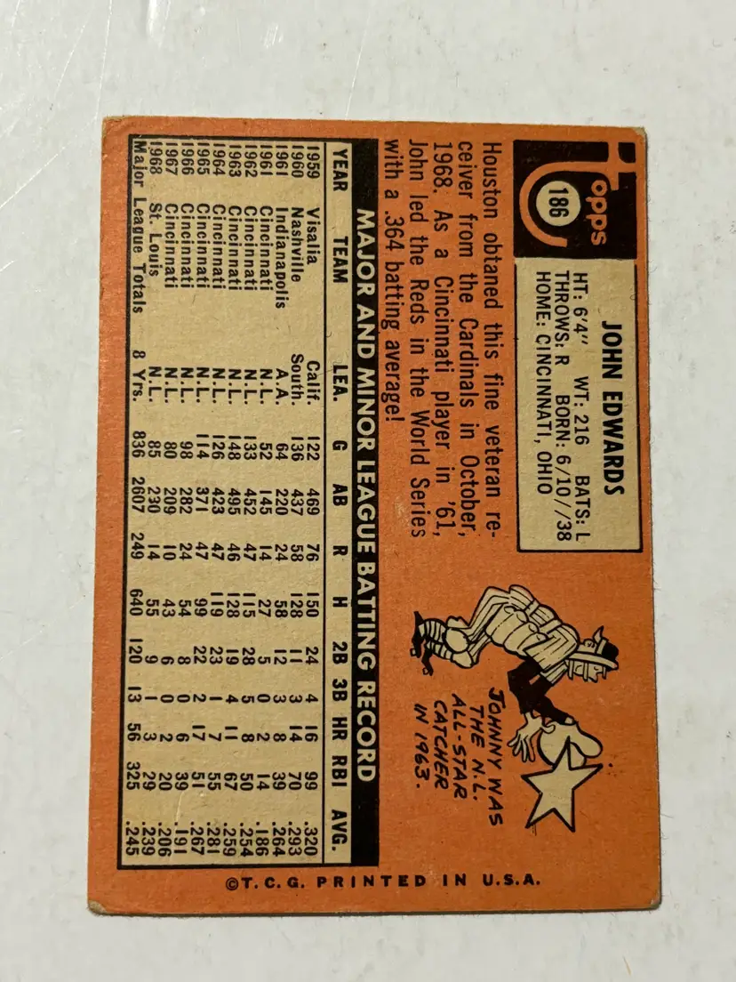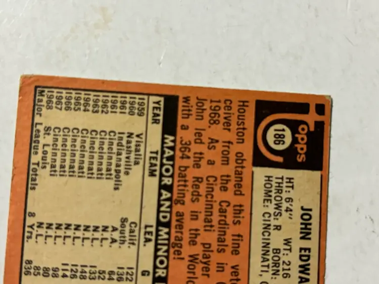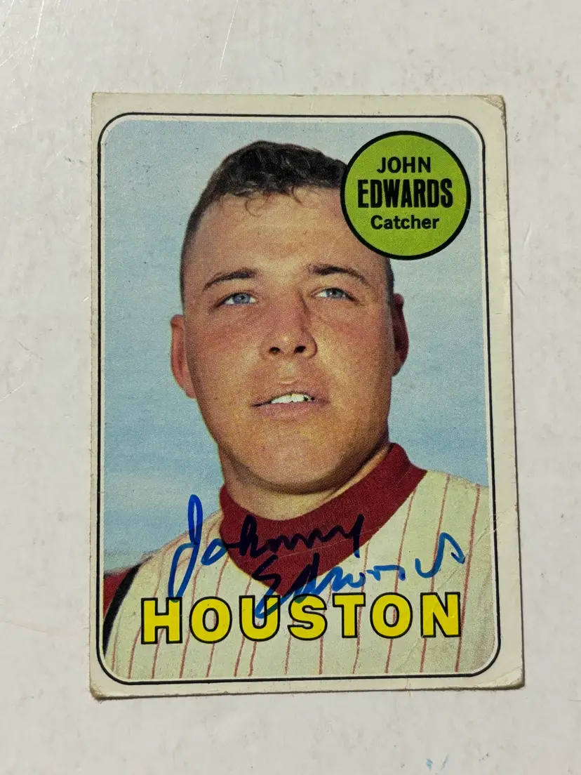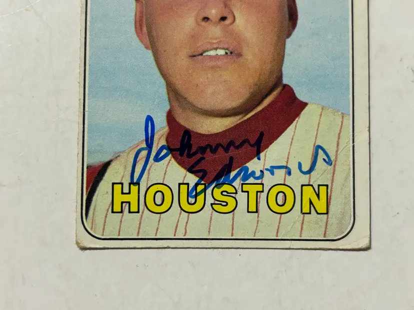 This vintage 1969 Topps baseball card is signed in blue sharpie. Card is creased on the front (see photos closely). Corners and edges also shown in photographs.