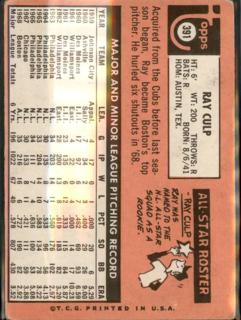 1969 Topps #391 Ray Culp - (pk3) - Boston Red Sox
