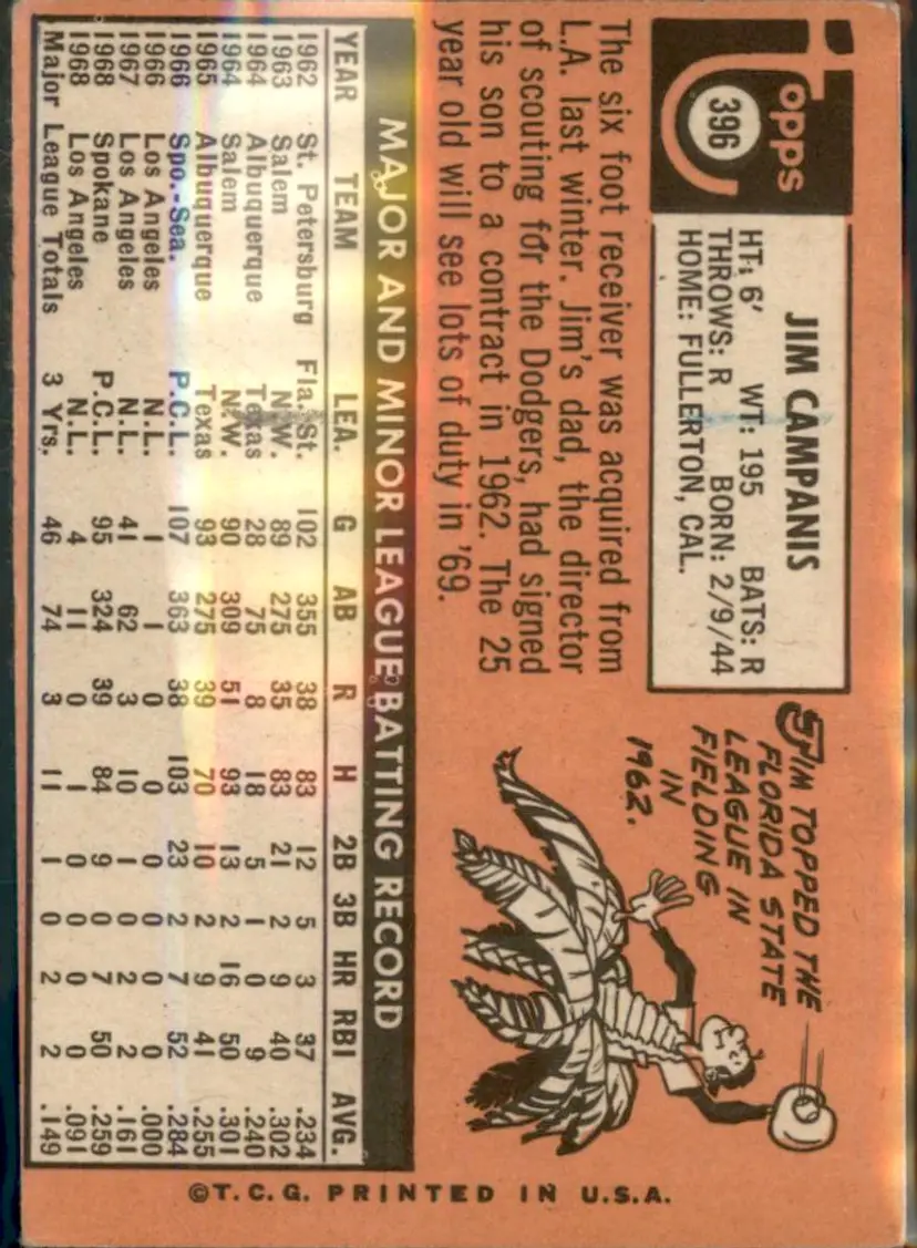 1969 Topps #396 Jim Campanis - (pk3) - Kansas City Royals