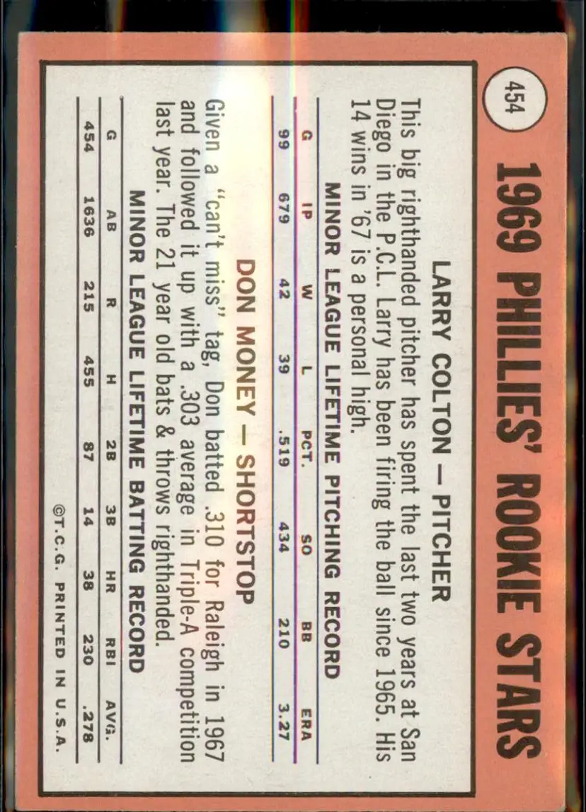 1969 Topps #454b Phillies 1969 Rookie Stars (Colton / Money) RC, VAR - ( pk3 ) - Philadelphia Phillies