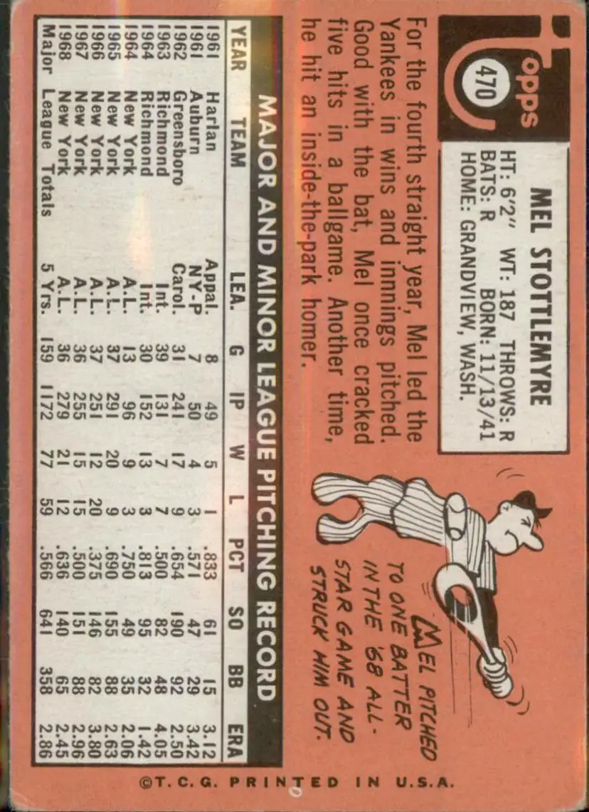 1969 Topps #470a Mel Stottlemyre - (pk3) - New York Yankees