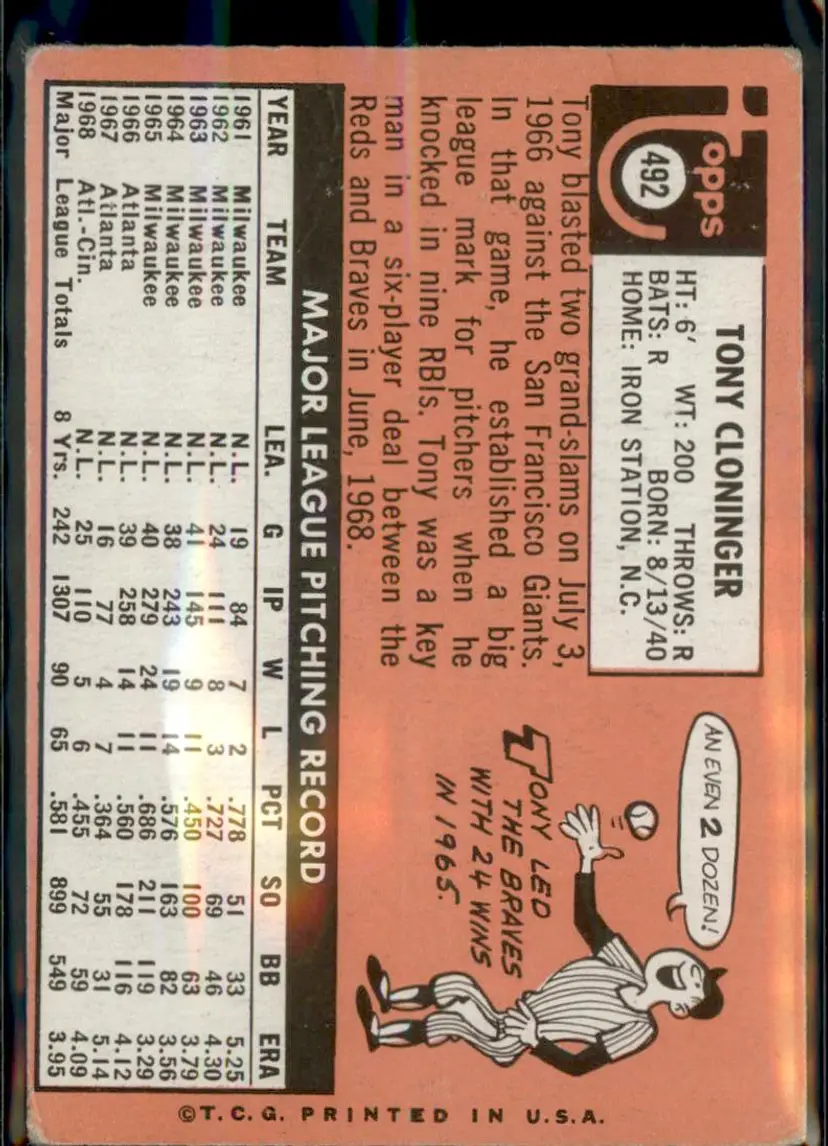 1969 Topps #492 Tony Cloninger - (pk3) - Cincinnati Reds